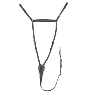 Нагрудник из натуральной кожи. Применяется при езде по пересеченной местности или в конкуре. Не дает седлу сползать назад. Ремешки для пристегивания к седлу на удобных карабинах. Для большего комфорта подперсье в месте контакта с телом лошади обшито искусственным мехом.