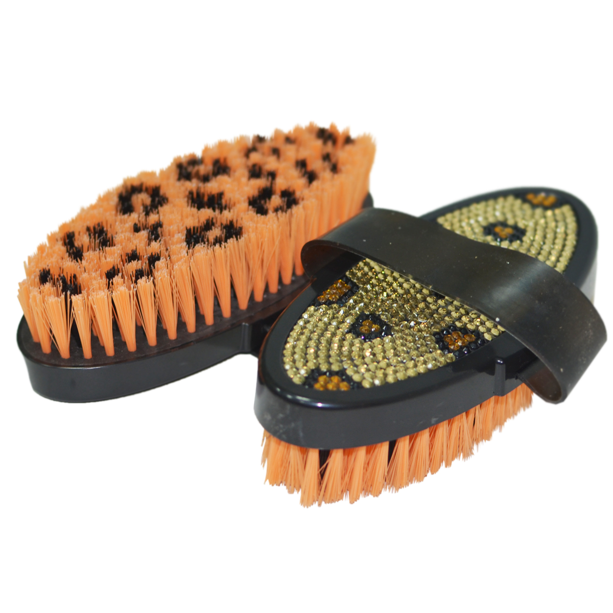 Щетка (brush) с уникальным дизайном. Основание щетки сделано из прочного пластика черного цвета, поверхность украшена стразами. Ручка выполнена из резины с блестящими вкраплениями. Щетка с плотной синтетической щетиной средней жесткости оранжевого цвета. Идеальна для чистки тела лошади, справляется даже с самыми сильными загрязнениями.
