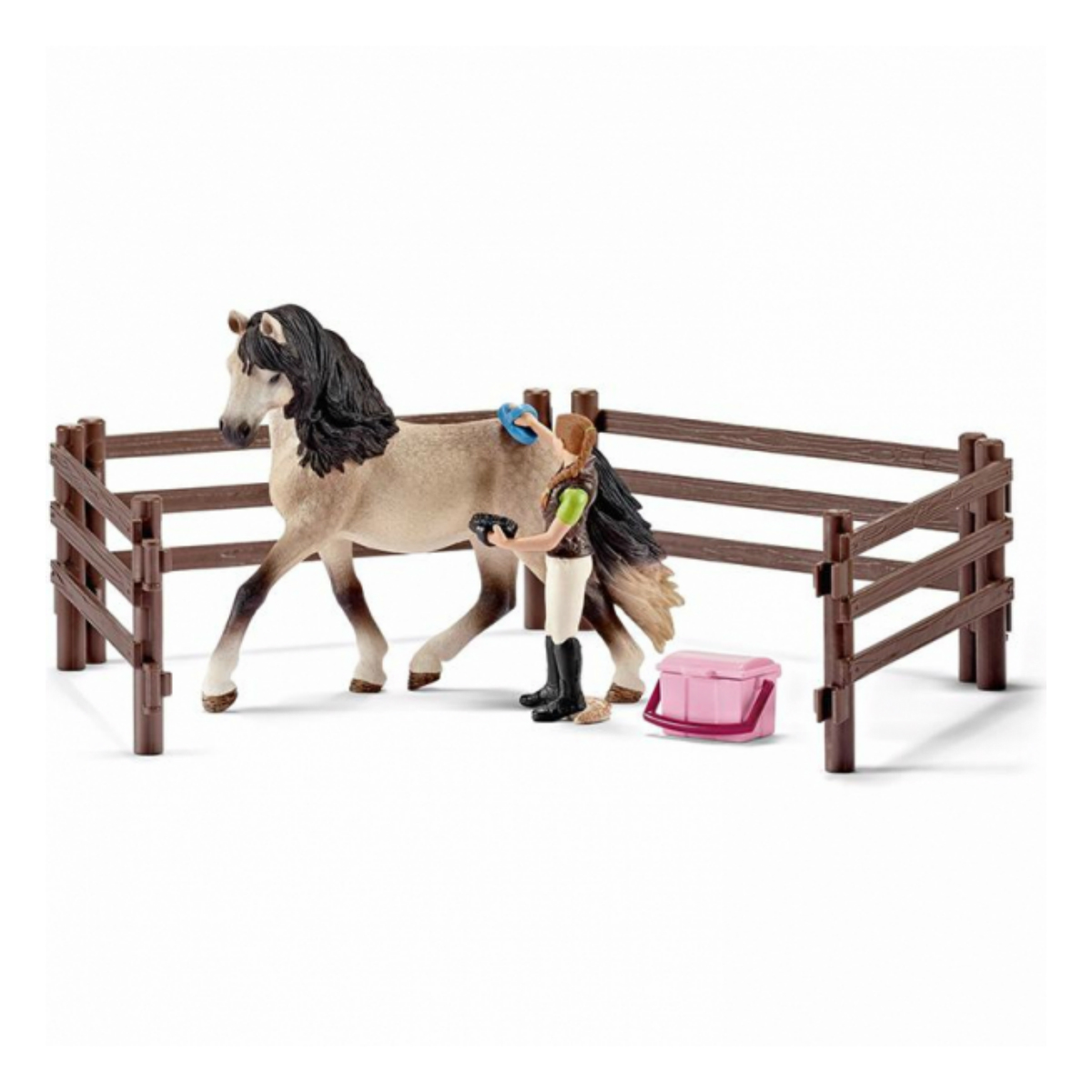 В набор входит: - андалузская кобыла; - конюх; - ящик для аксессуаров; - 4 элемента для постройки загона; - черная и голубая щетка для ухода.