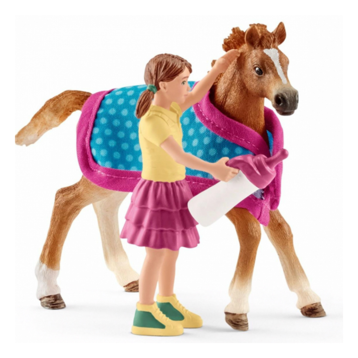 В набор входит: - фигурка девочки; - чистокровный английский жеребенок; - попона; - бутылочка.