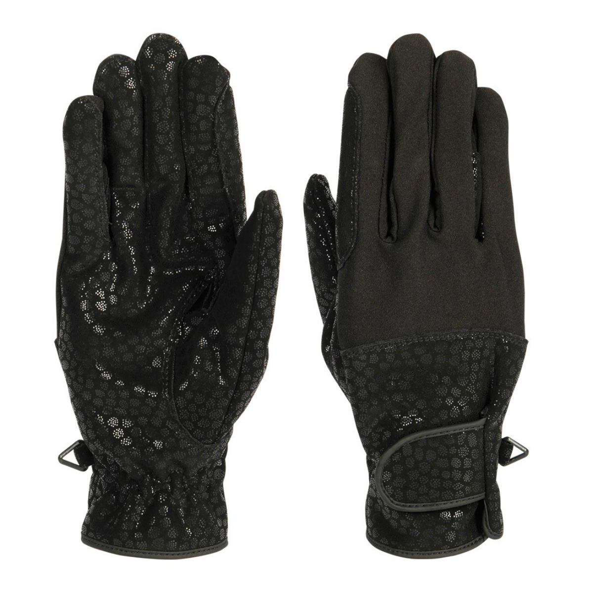 Стильные перчатки для верховой езды (riding gloves) из искусственной кожи PU. Вставки из лайкры предоставляют свободу движениям всадника. Украшены блестящим принтом. Перчатки хорошо облегают руки не стесняя движения. Застегиваются на липучку в области запястья. С усилением в области мизинца и указательного пальца для лучшего сцепления с поводом.