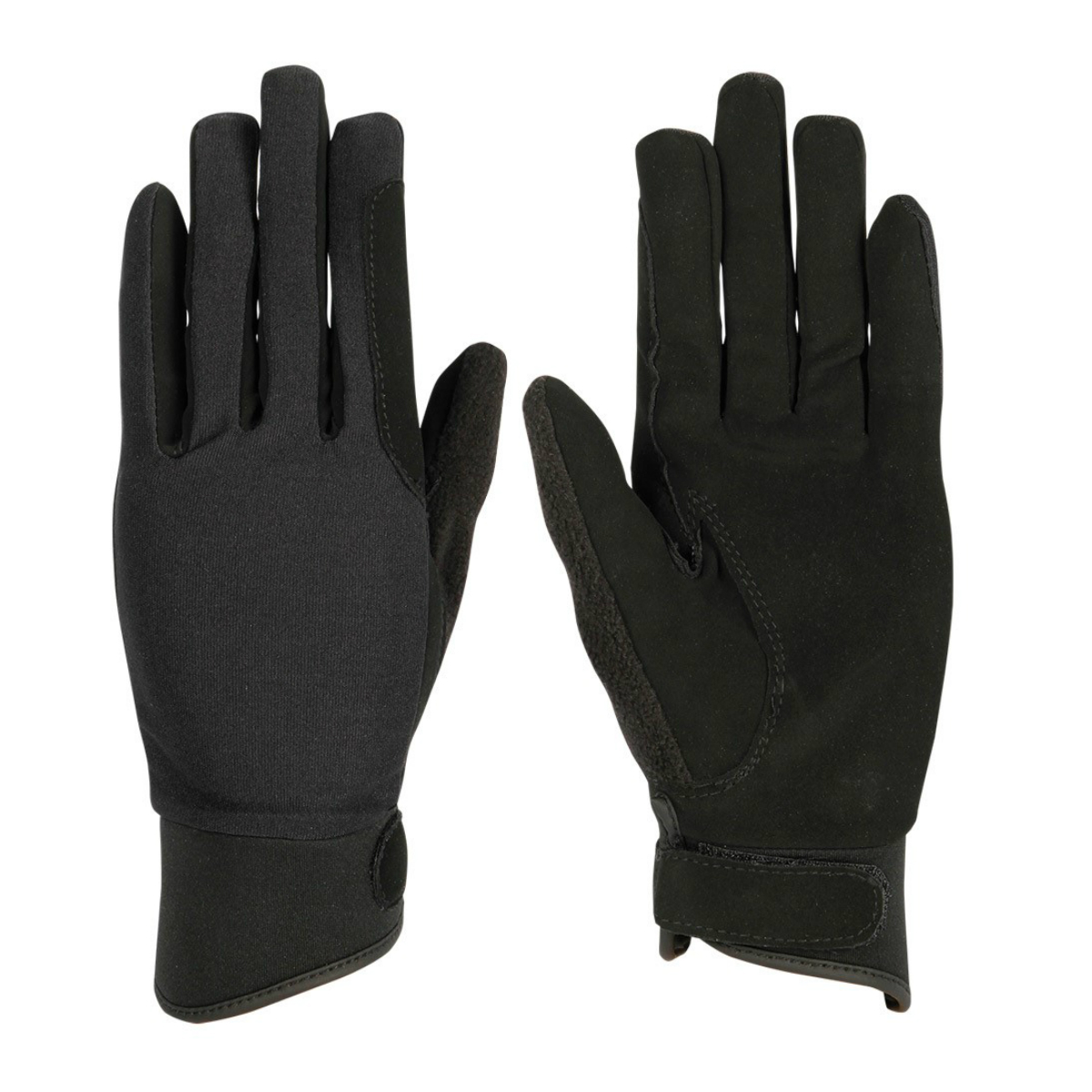 Удобные перчатки для верховой езды (riding gloves). Верхняя часть перчаток выполнена из лайкры. Прочный замшевый материал на ладони обеспечивает оптимальное сцепление с поводом. Мягкая флисовая вставка на большом пальце. Перчатки хорошо облегают руки, не стесняя движения. Застегиваются на липучку в области запястья. С усилением в области указательного пальца.
