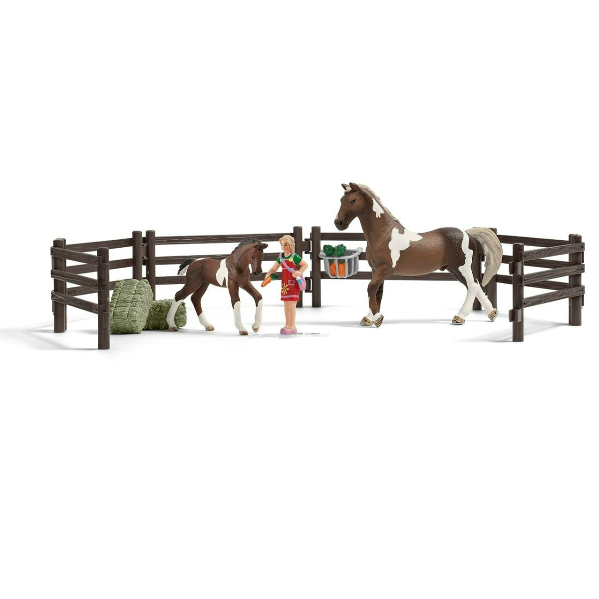 В набор входят детали, с помощью которых можно построить заграждение загона, две фигурки лошади (взрослая лошадь и жеребенок), фигурка наездницы, два пучка морковки и два брикета сена для кормления лошадей.