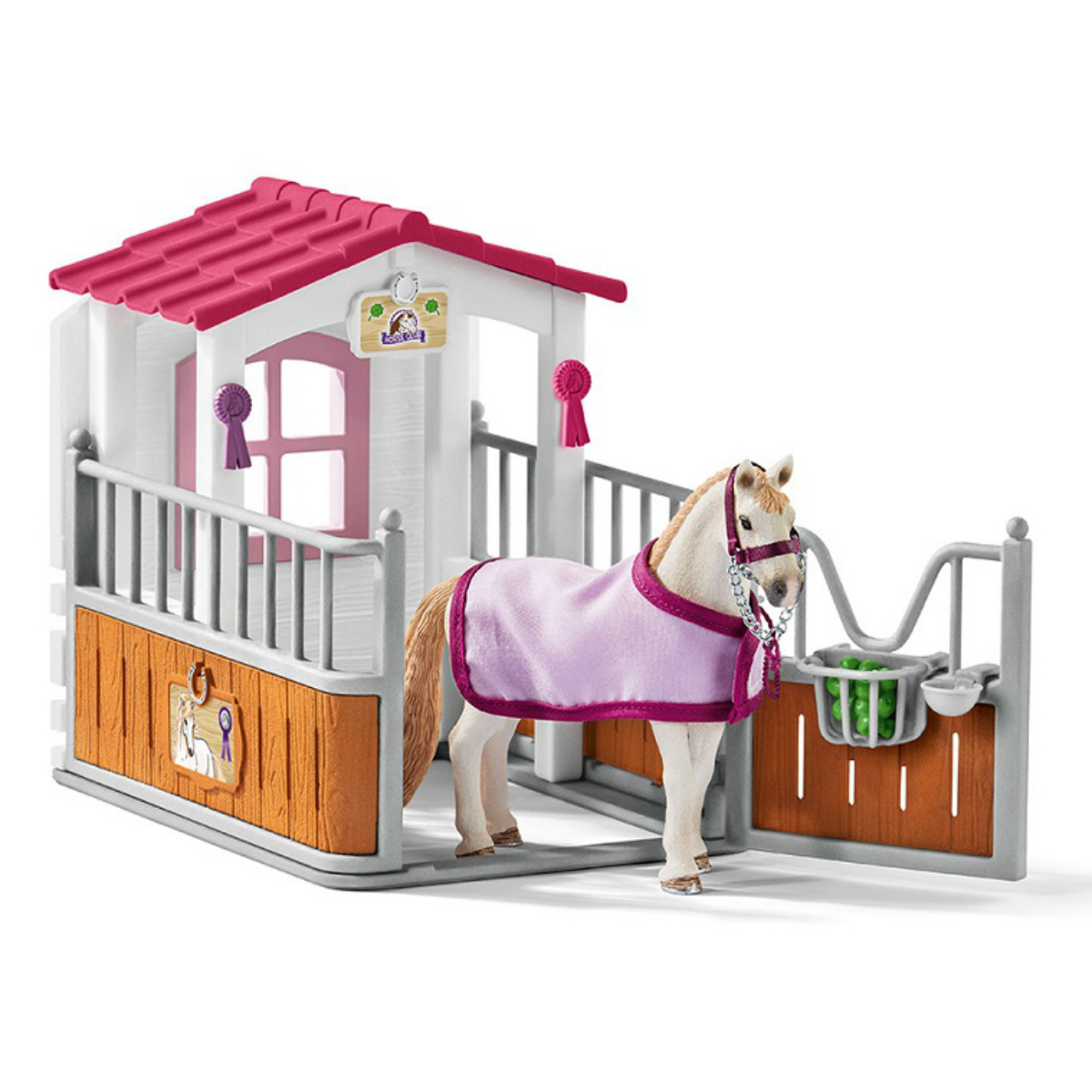В красивом и аккуратном стойле с розовой крышей лошадка чувствует себя действительно хорошо. В стойле просторно, много света и свежего воздуха, и можно укрыться от дождика. Когда лошадка проголодается, она сможет поесть яблок из кормушки. Конечно, в стойле есть поилка, чтобы лошадка не испытывала жажду. А когда приходит время тренировки, ворота открываются, и лошадь с радостью бежит к тренировочной арене.