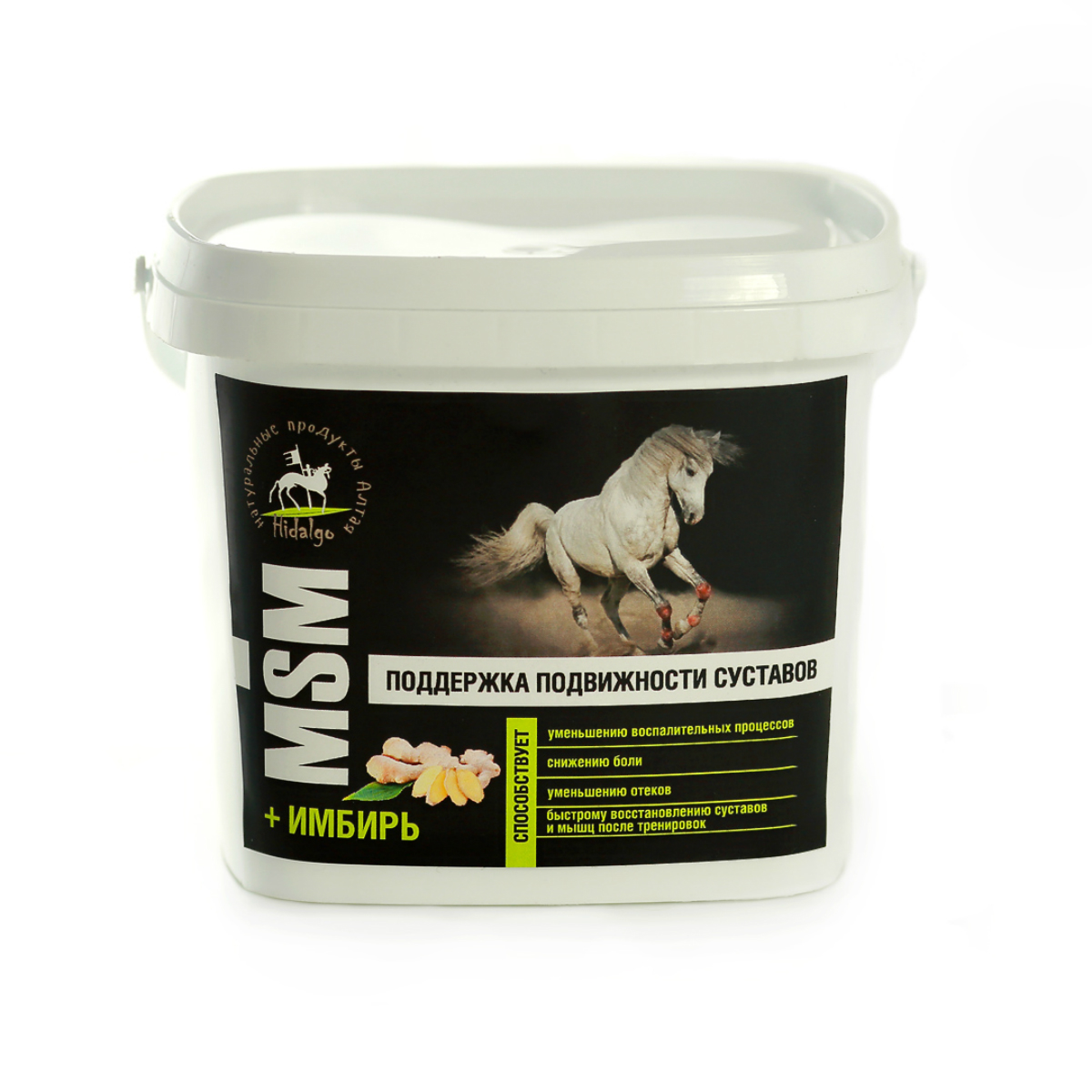 Натуральная кормовая добавка для лошадей, содержащая метилсульфонилметан (MSM) – серу органического происхождения и порошок корня имбиря, витамин С.