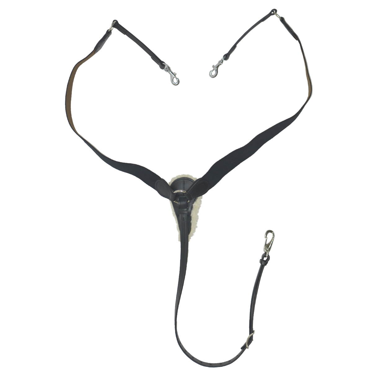Нагрудник эластичный. Применяется при езде по пересеченной местности или в конкуре. Не дает седлу сползать назад. Ремешки для пристегивания к седлу на удобных карабинах. Для большего комфорта подперсье в месте контакта с телом лошади обшито искусственным мехом.