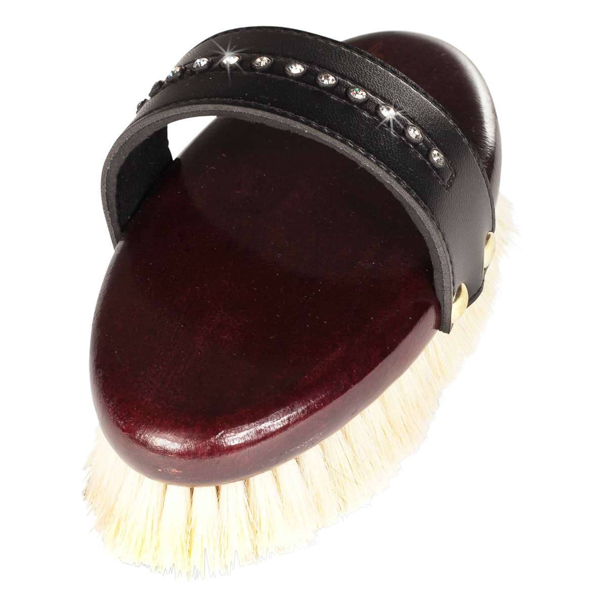 Премиум щётка с натуральной щетиной из козьего волоса на деревянной основе. Обладает необычайной мягкостью (супер мягкая). Благодаря мягкой структуре не травмирует и не выдирает шерсть. Подходит для очень бережной чистки морды лошади. Удобный ремешок для фиксации руки украшен кристаллами.
