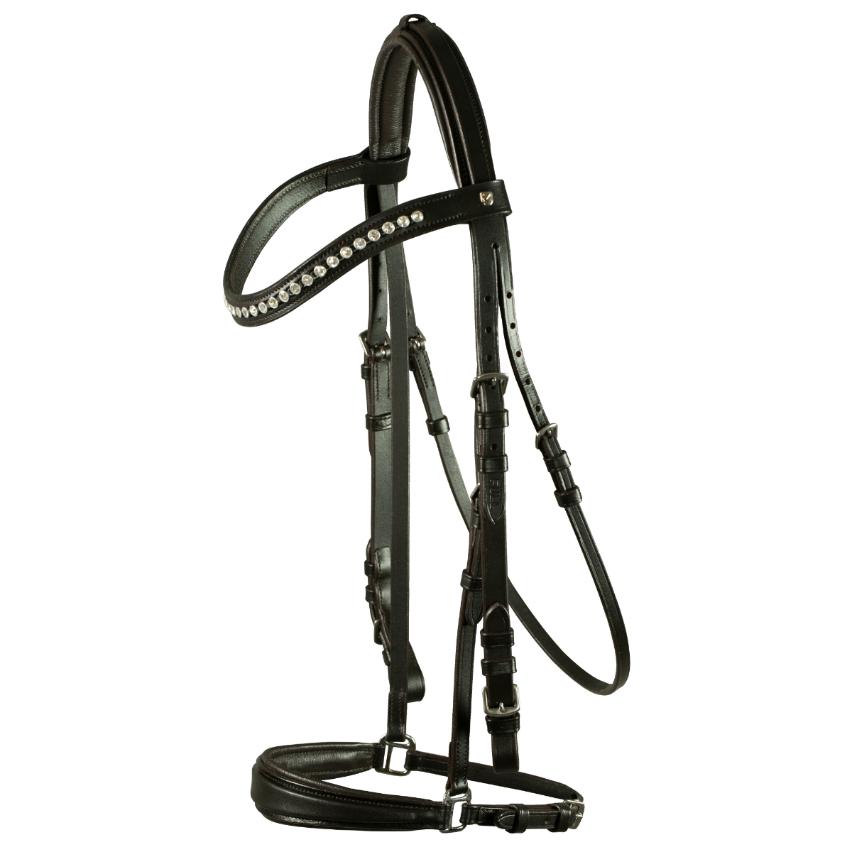 Элегантное оголовье из натуральной кожи (Leather Bridle). Уздечку украшает стильный изогнутый налобник с крупными стразами. Капсюль и затылочный ремень на мягкой подложке, что обеспечивает максимальный комфорт вашей лошади. Пряжки серебристого цвета. Повод и трензель в комплект не входят.