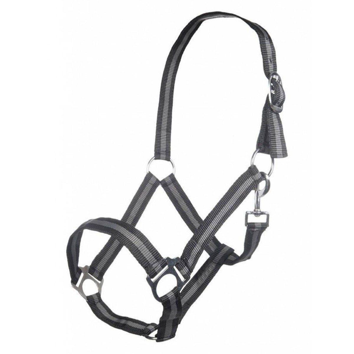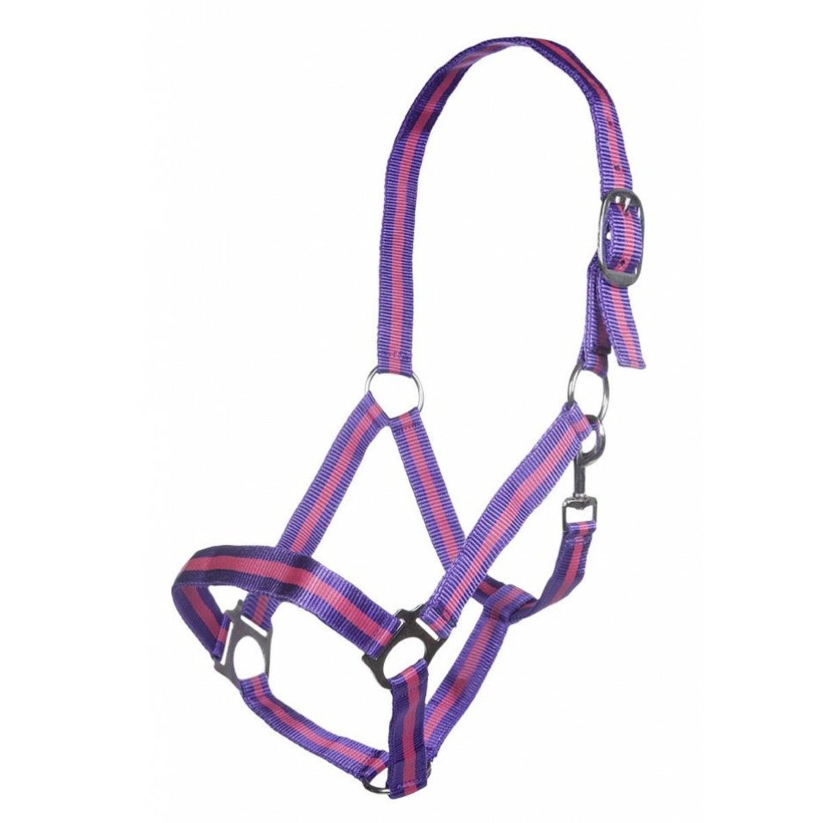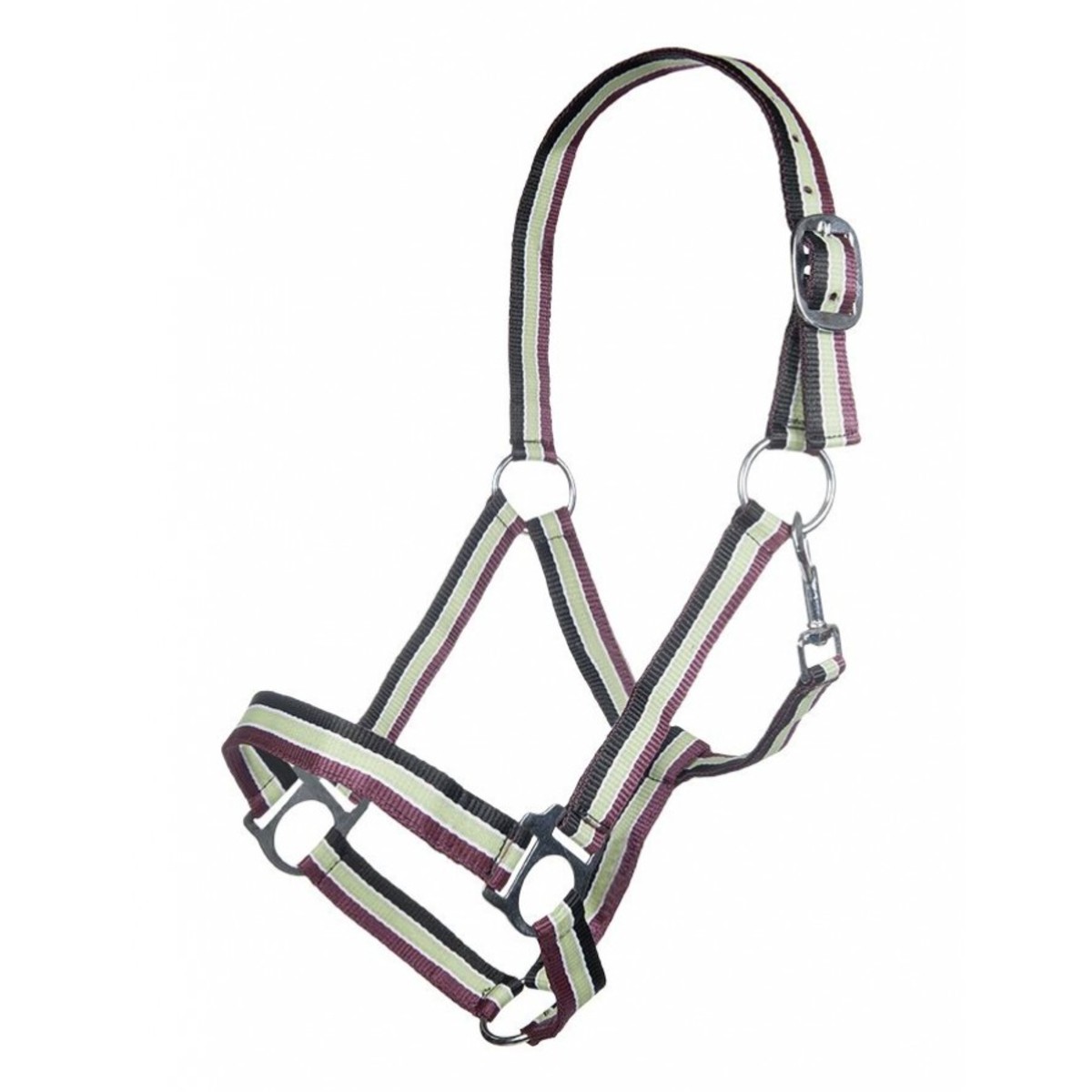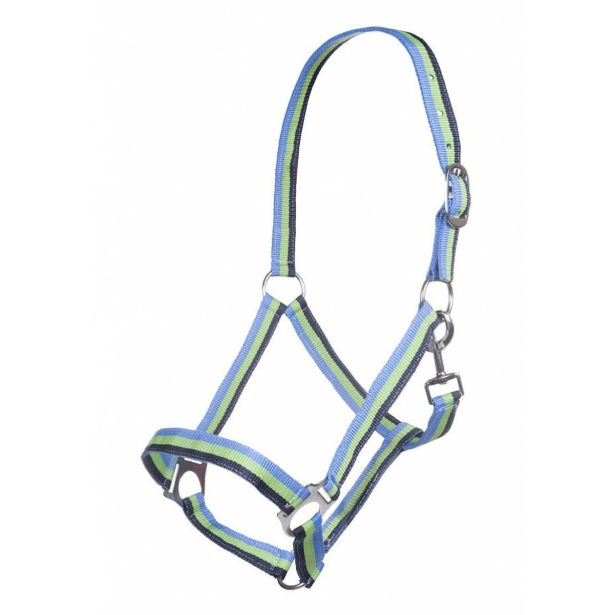 Прочный разноцветный нейлоновый недоуздок (Halter). Затылочный ремень регулируются. Недоуздок легко снимается и одевается благодаря карабину. Фурнитура серебристого цвета.