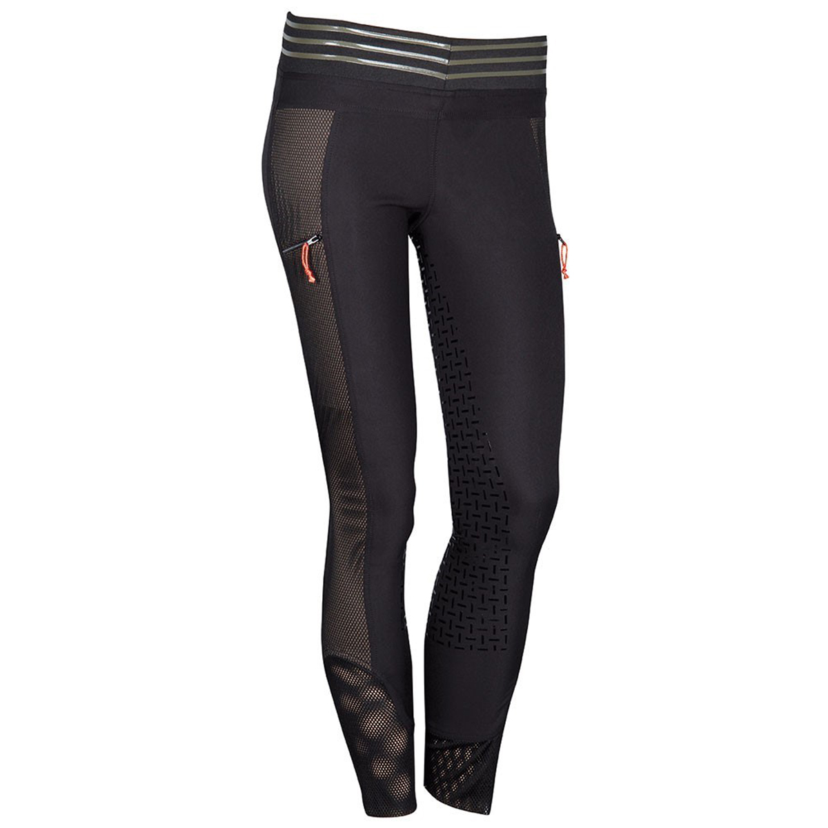 Бриджи с полной силиконовой леей (Breeches with Silicone Patch) без молнии. Силиконовая лея предполагает отстутствие лишних швов в зоне колен и обеспечивает наибольшую фиксацию в седле. Изготовлены из чрезвычайно удобной и эластичной ткани. С обеих сторон контрастные вставки, покрытые сеткой. Спереди украшены декоративными кармашками на молниях. В области щиколотки имеется эластичная сетчатая вставка для удобства одевания.
