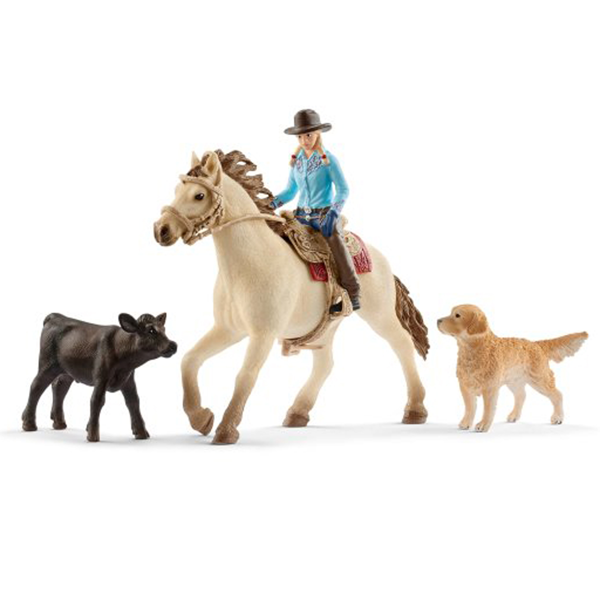 Набор позволит ребенку устроить увлекательные сюжетные игры с прекрасной девушкой-ковбоем. Всадница сидит в седле естественно и слегка понукает лошадь. Ковбойская лошадь управляется свободными, ненатянутыми поводьями и чаще одной рукой.