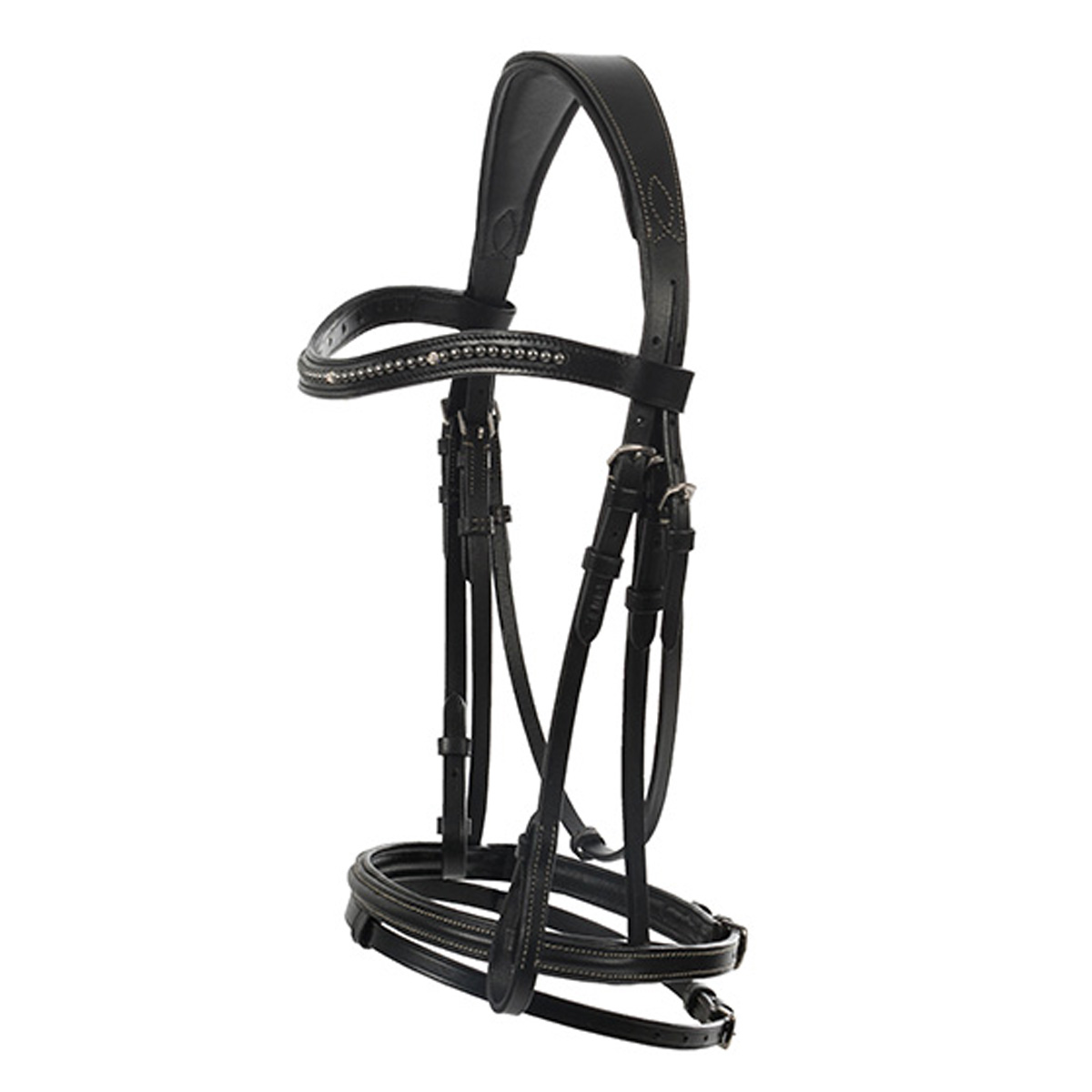 Элегантное оголовье из натуральной кожи высокого качества (Leather Bridle). Уздечку украшает стильный налобник с жемчужинами и бусинами со стразами. У затылочного ремня анатомической формы и капсюля есть мягкая подложка, что обеспечивает комфорт вашей лошади. Фурнитура серебристого цвета. Повод и трензель в комплект не входят.
