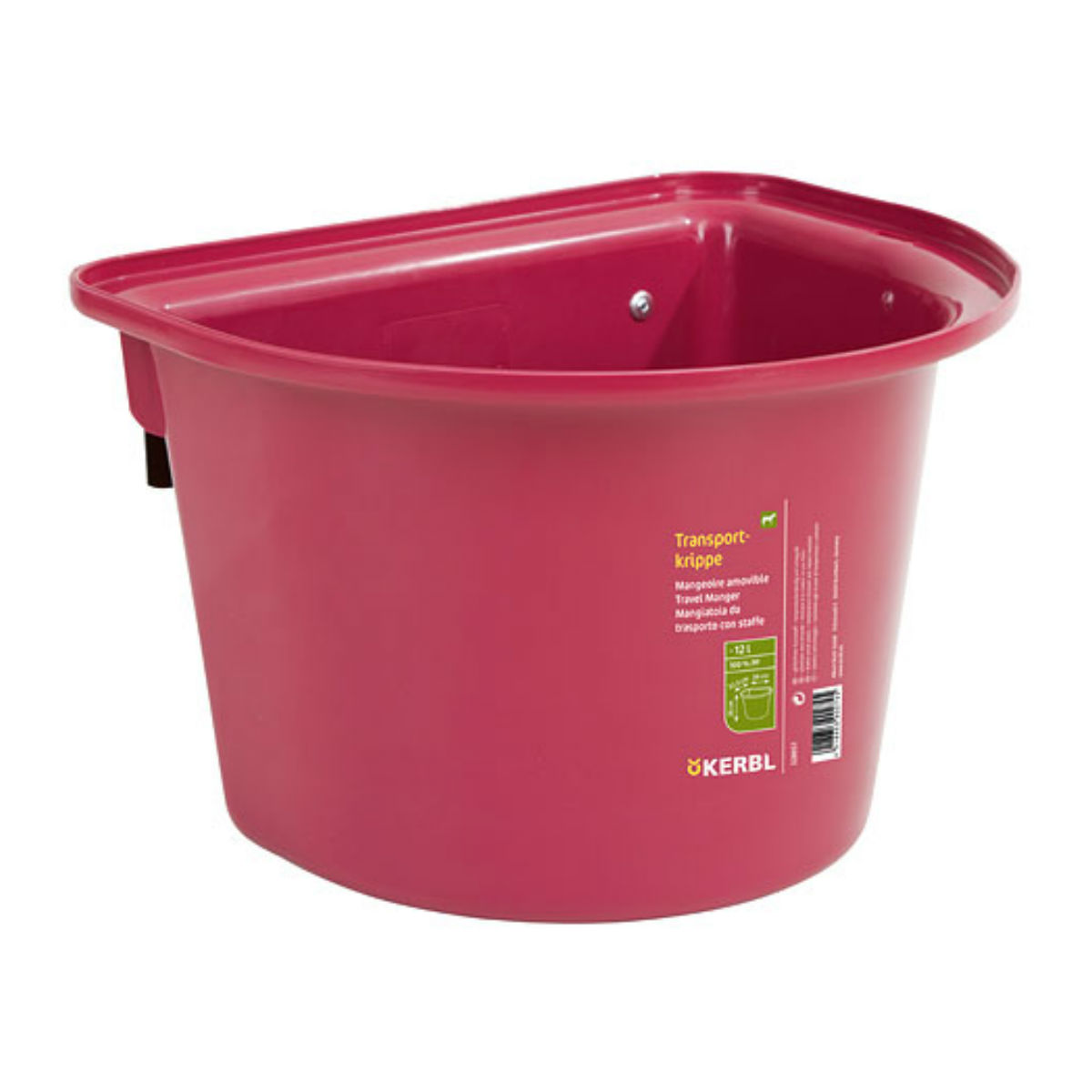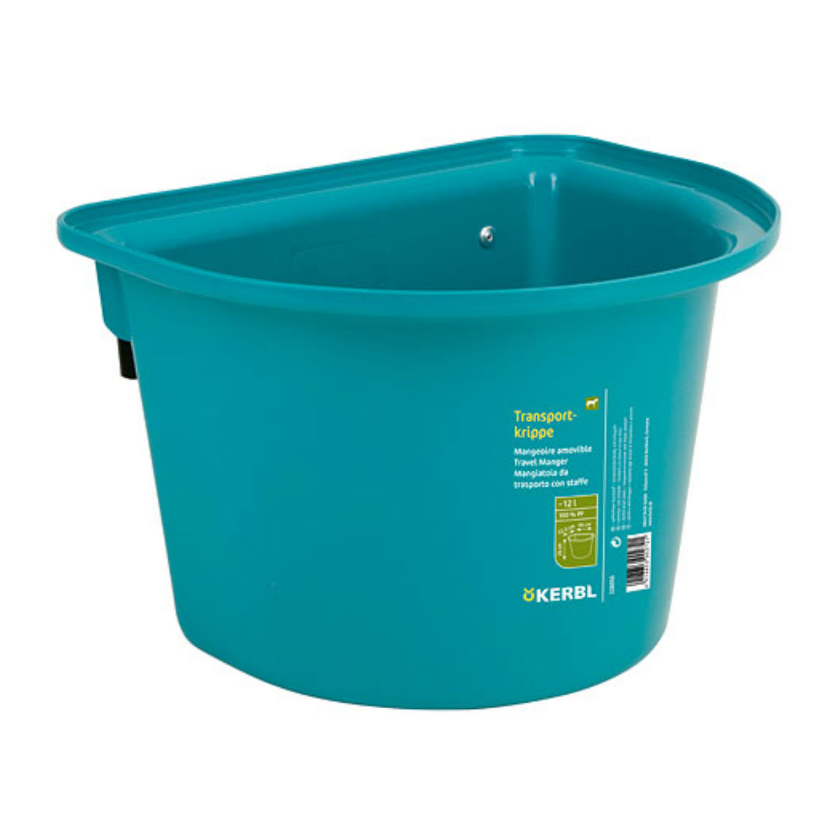 С задней стороны, у кормушки плоская стенка, на которой имеются 2 дужки, позволяющие ее подвесить, в частности, на ограду загона. Внутри имеется шкала заполняемого объема в литрах. Шаг деления 1 литр. Материал кормушки абсолютно безопасен для животных.