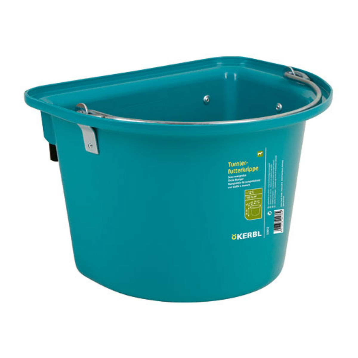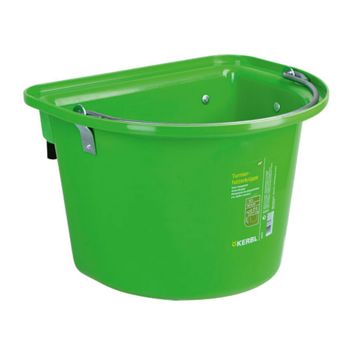 С задней стороны, у кормушки плоская стенка, на которой имеются 2 дужки, позволяющие ее подвесить, в частности, на ограду загона. Внутри имеется шкала заполняемого объема в литрах. Шаг деления 1 литр. Материал кормушки абсолютно безопасен для животных.