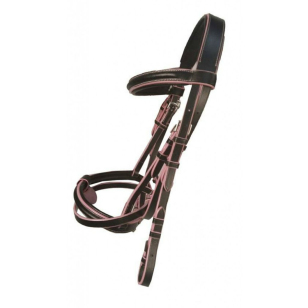 Оголовье из натуральной кожи (Leather Bridle). Уздечка чёрная, украшена цветным кантом розового или жёлтого цвета. Капсюль и затылочный ремень на мягкой подложке, что обеспечивает максимальный комфорт вашей лошади. Пряжки серебристого цвета. В комплекте с уздечкой идет тесьмяный повод с ограничителями.