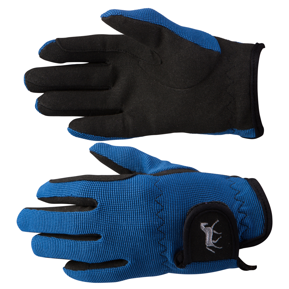 Кофмортные детские перчатки для верховой езды (riding gloves). Перчатки из эластичной ткани, внутренняя сторона из искусственной замши. С усилением в области указательного пальца для лучшего сцепления с поводом. Застегиваются на липучку в области запястья. Липучка украшена вышивкой в виде лошадки.