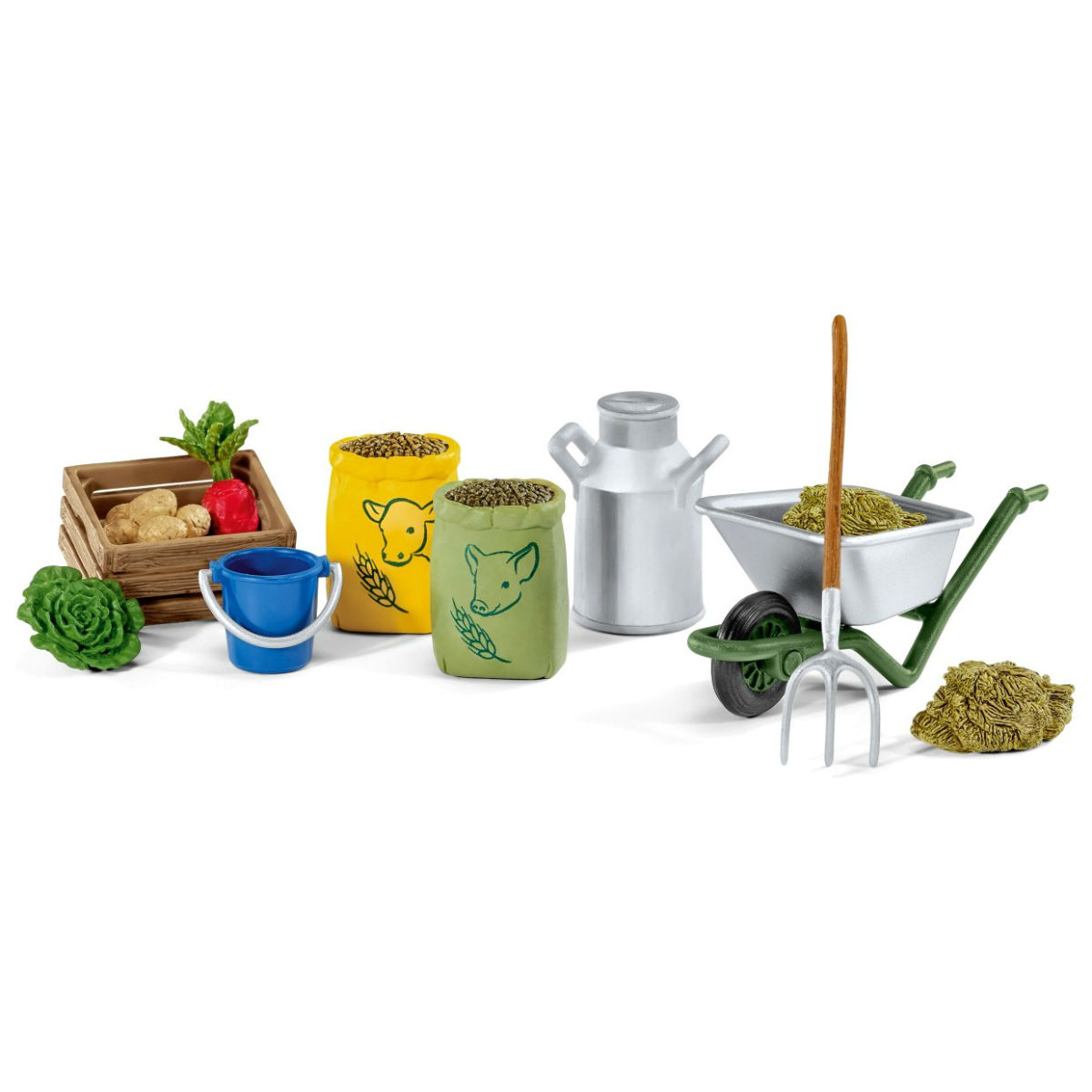 Ящик для фруктов и овощей, Свекла, Картофель, Салат, 2 мешка с зерном, Бидон, Тачка, Грабли, Сено.