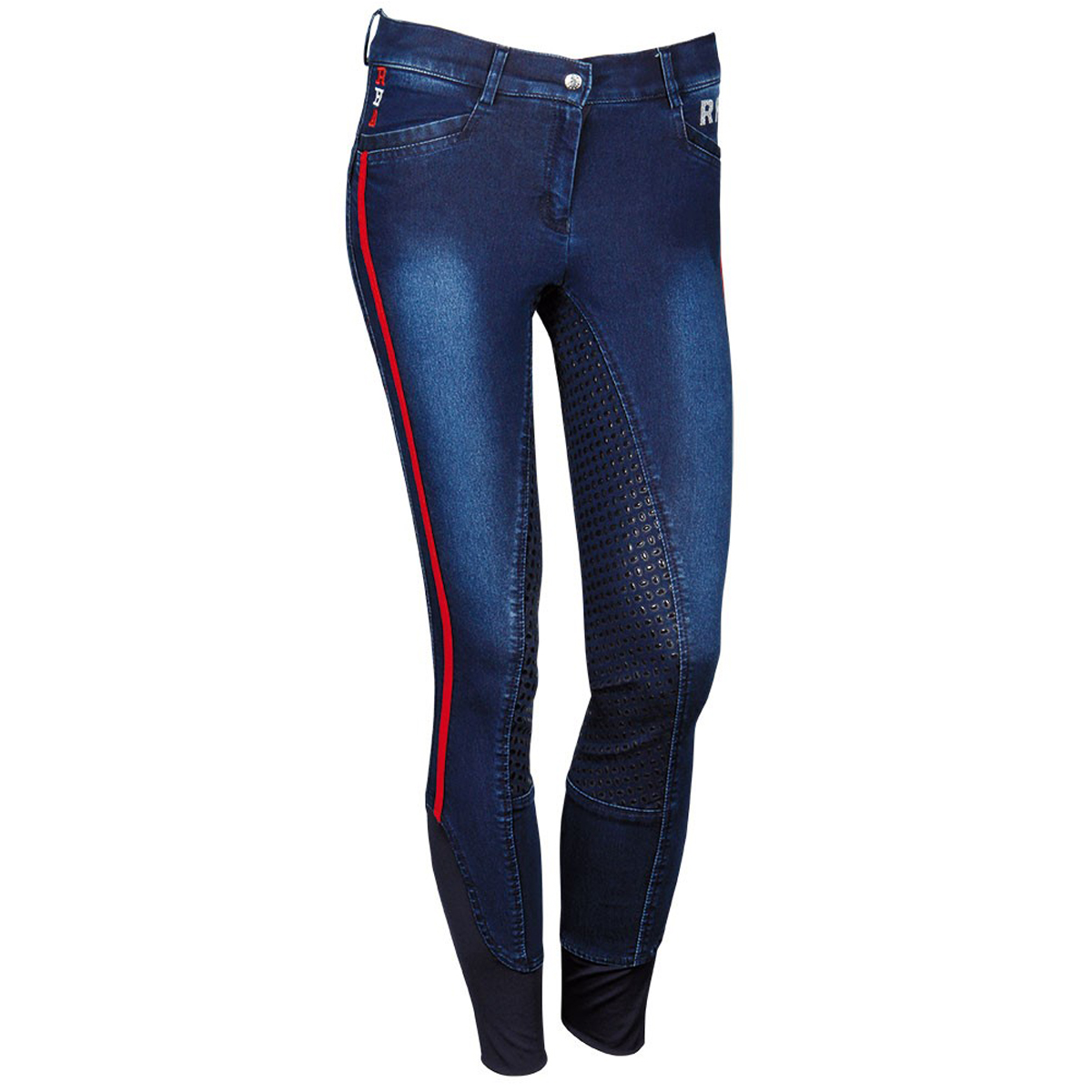 Джинсовые бриджи с полной силиконовой леей (Women's Denim Breeches with Silicone Patch) и лампасами. Износостойкие и хорошо держат форму. Похожи на обычные джинсы, отлично садятся по фигуре. Застёгиваются на молнию и брючный крючок. На бриджах есть два кармана спереди и два задних кармана на молнии. Бриджи украшены небольшой вышивкой спереди и силиконовой надписью сзади. Внизу брючин эластичные вставки для удобства одевания.