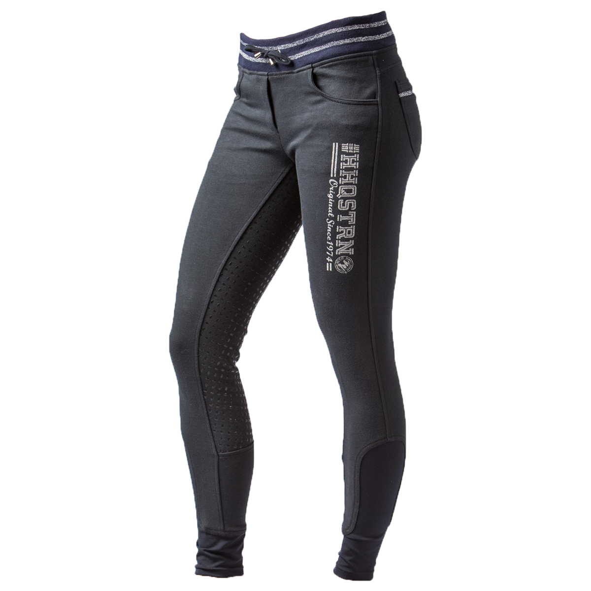 Бриджи с полной силиконовой леей (Breeches with Silicone Patch) без молнии. Силиконовая лея предполагает отстутствие лишних швов в зоне колен и обеспечивает наибольшую фиксацию в седле. Есть два кармана спереди и два сзади. Изготовлены из удобной хлопковой ткани. Украшены принтами и вставками серебристого цвета. В области щиколотки имеется эластичная вставка для удобства одевания.