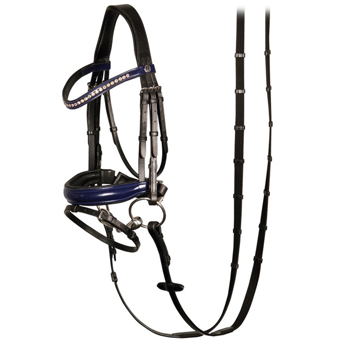 Элегантное оголовье из кожи (Leather Bridle) с широким капсюлем. У затылочного ремня анатомической формы и капсюля есть мягкая подложка, что обеспечивает комфорт вашей лошади. Уздечку украшает стильный налобник с лаковой синей кожей и крупными кристаллами. Широкий капсюль также украшен синей лаковой кожей. Ширина капсюля - 4,3 см. Фурнитура серебристого цвета. В комплект входит тесьмяный повод с ограничителями. Трензель в комплект не входит.