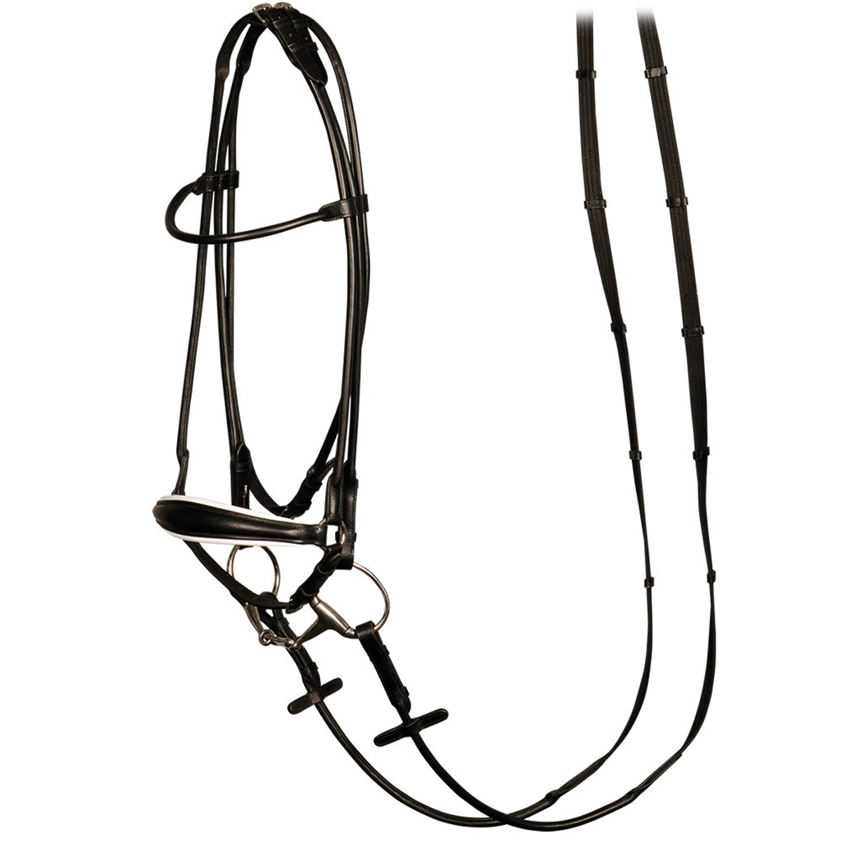 Кожаное оголовье (Leather Bridle) с широким капсюлем. Капсюль с мягкой белой подложкой. Ширина капсюля - 4 см. Фурнитура серебристого цвета. В комплект входит тесьмяный повод с ограничителями. Трензель в комплект не входит.