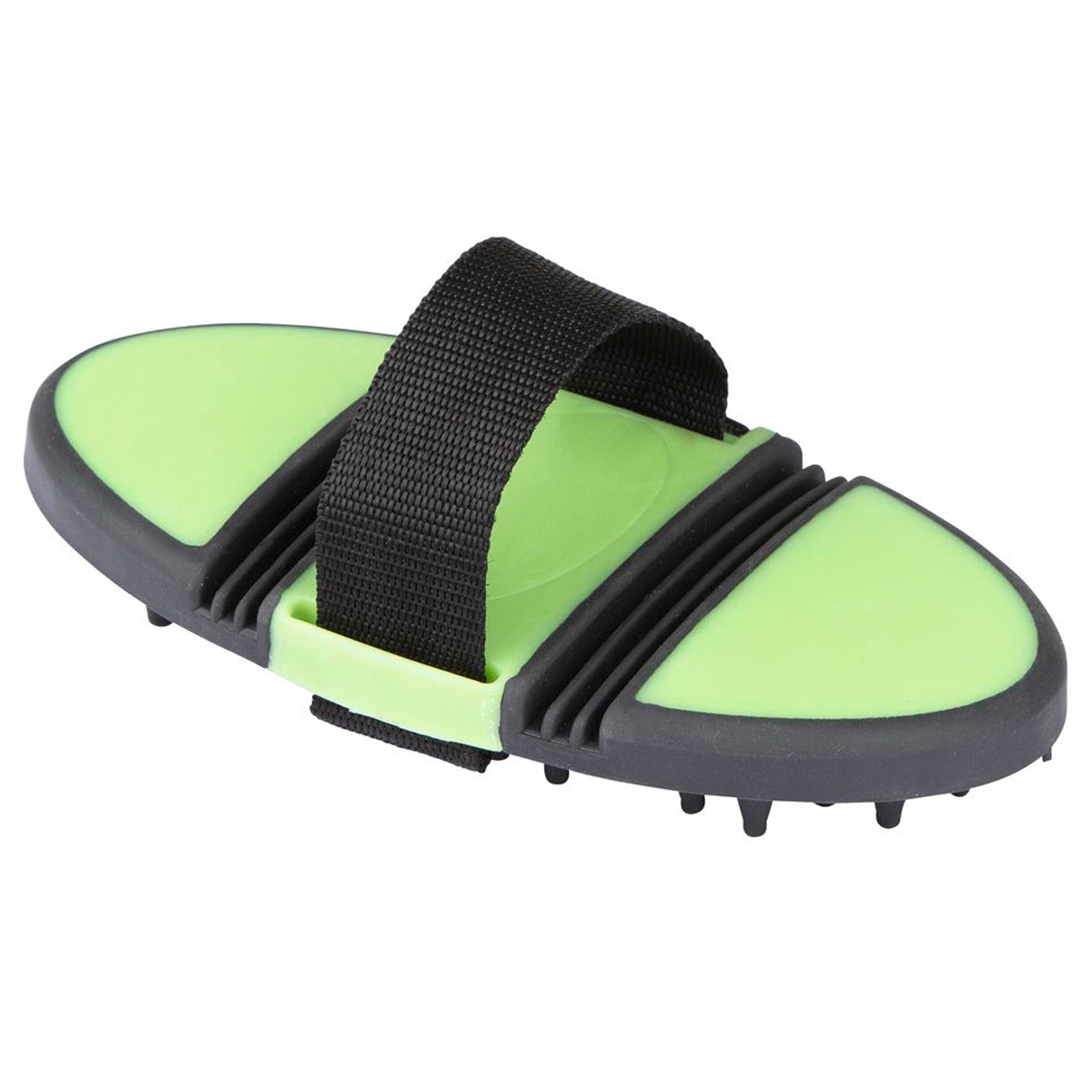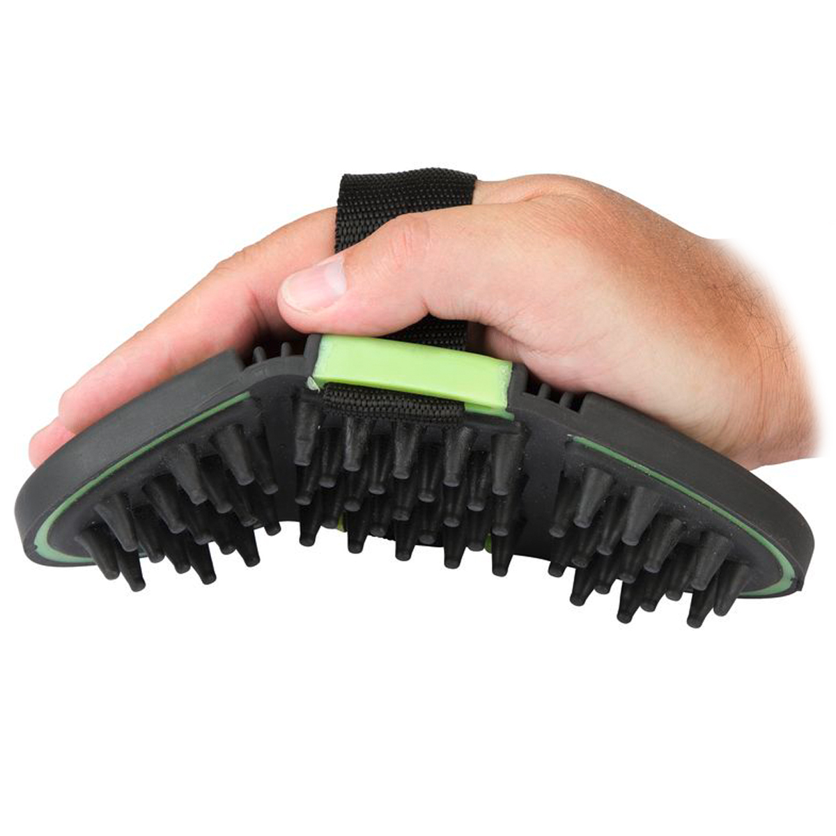 Гибкая массажная щётка для ухода за лошадью из мягкой резины. Хорошо вычищает пыль и грязь из шерсти лошади, при этом массируя кожу с помощью специальных конусовидных шипов из резины . Надевается на руку, проста в использовании благодаря гибкой спинке.