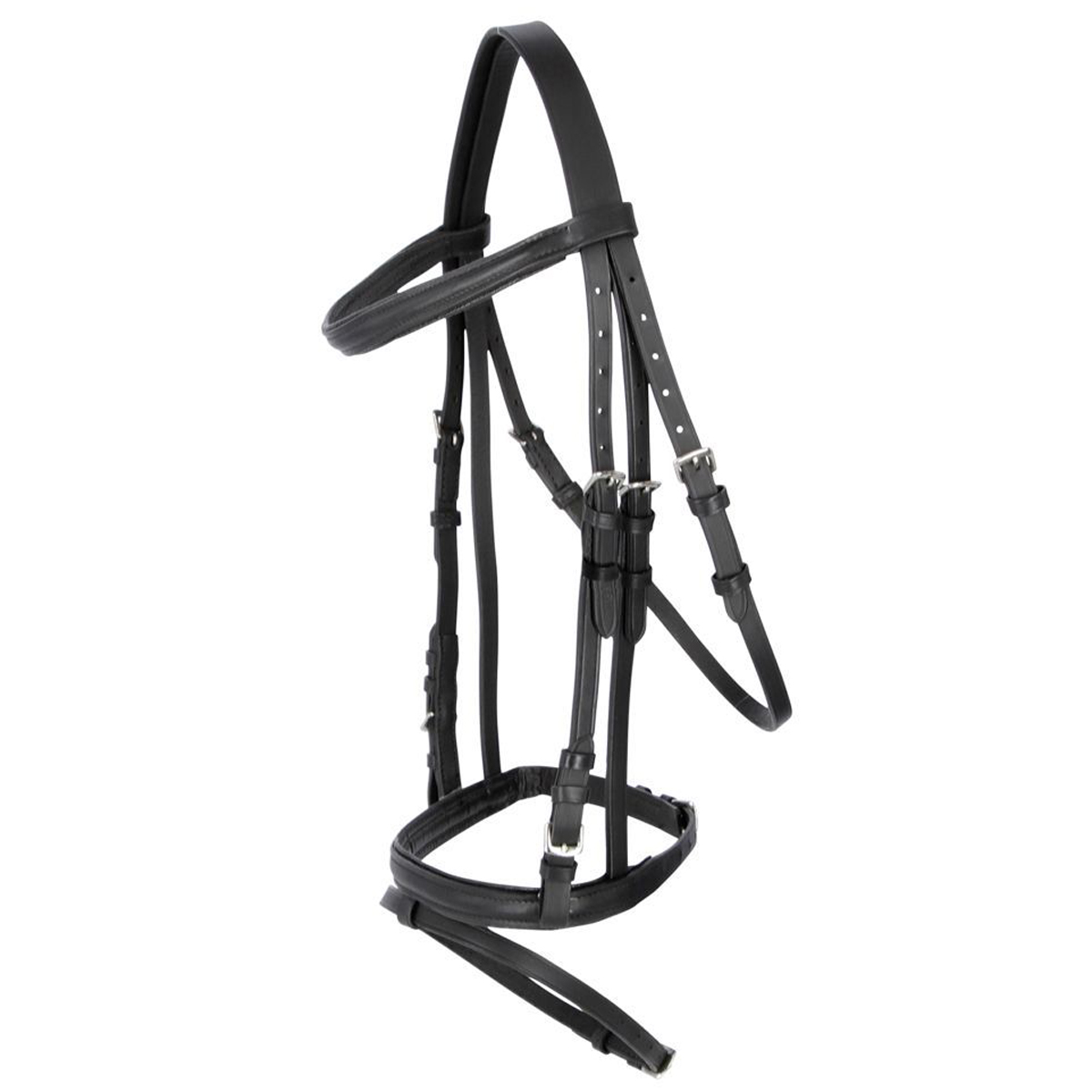 Оголовье из натуральной кожи эконом-класса (Leather Bridle). Тонкий капсюль и налобный ремень. В комплекте с уздечкой идет тесьмяный повод. Фурнитура серебристого цвета. Трензель в комплект не входит.