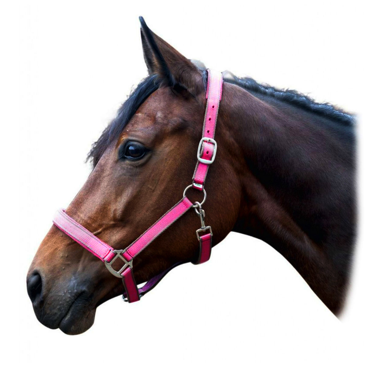 Двухцветный недоуздок (Halter) из прочного полипропилена. Затылочный и носовой ремни имеют мягкую махровую подложку, что предотвращает натирание. Фурнитура серебристого цвета.