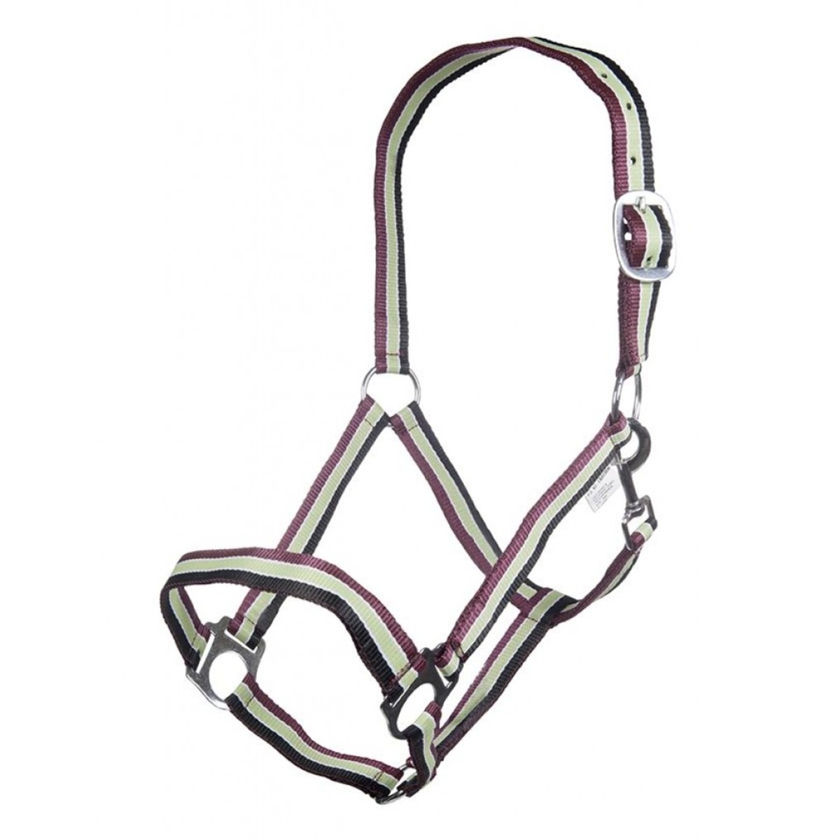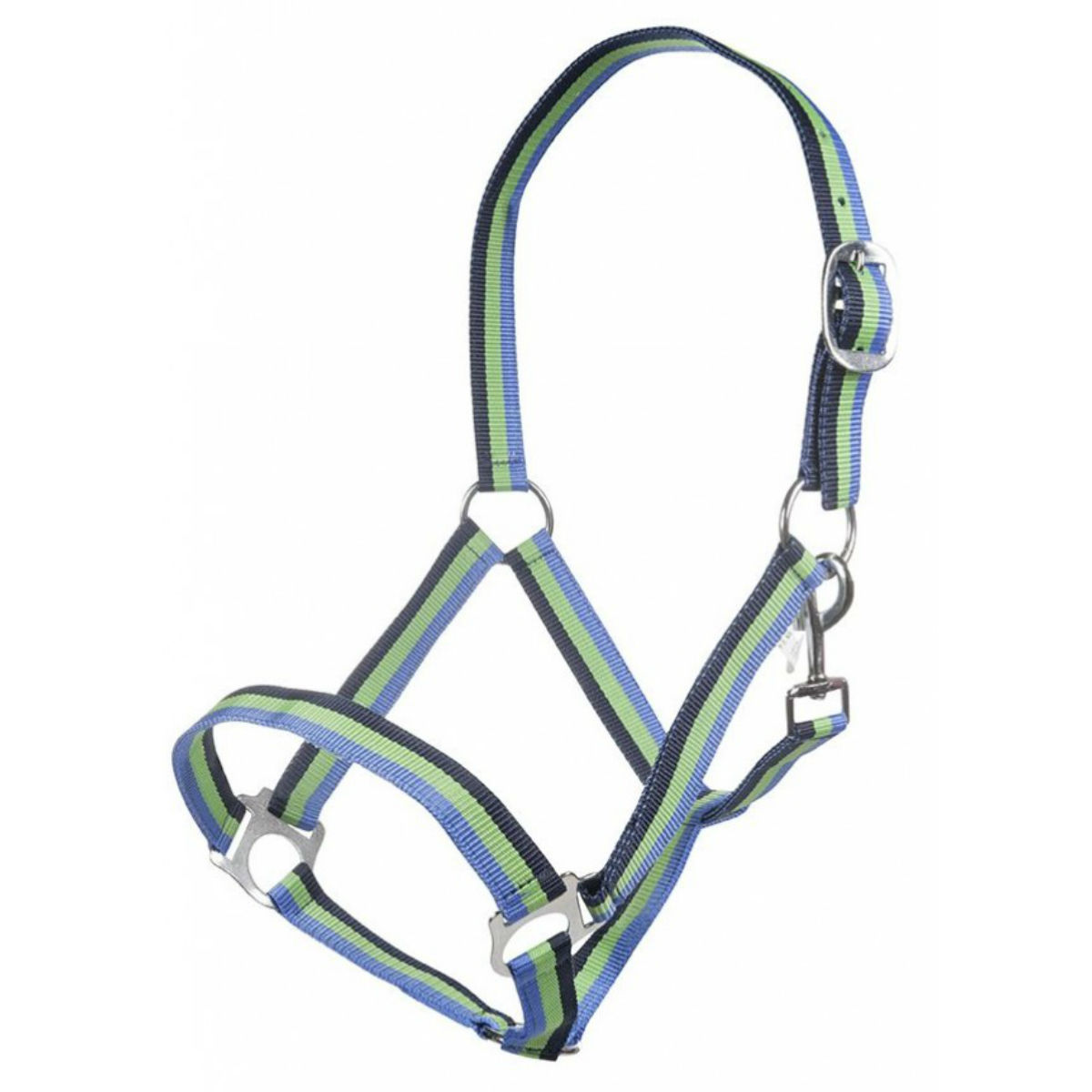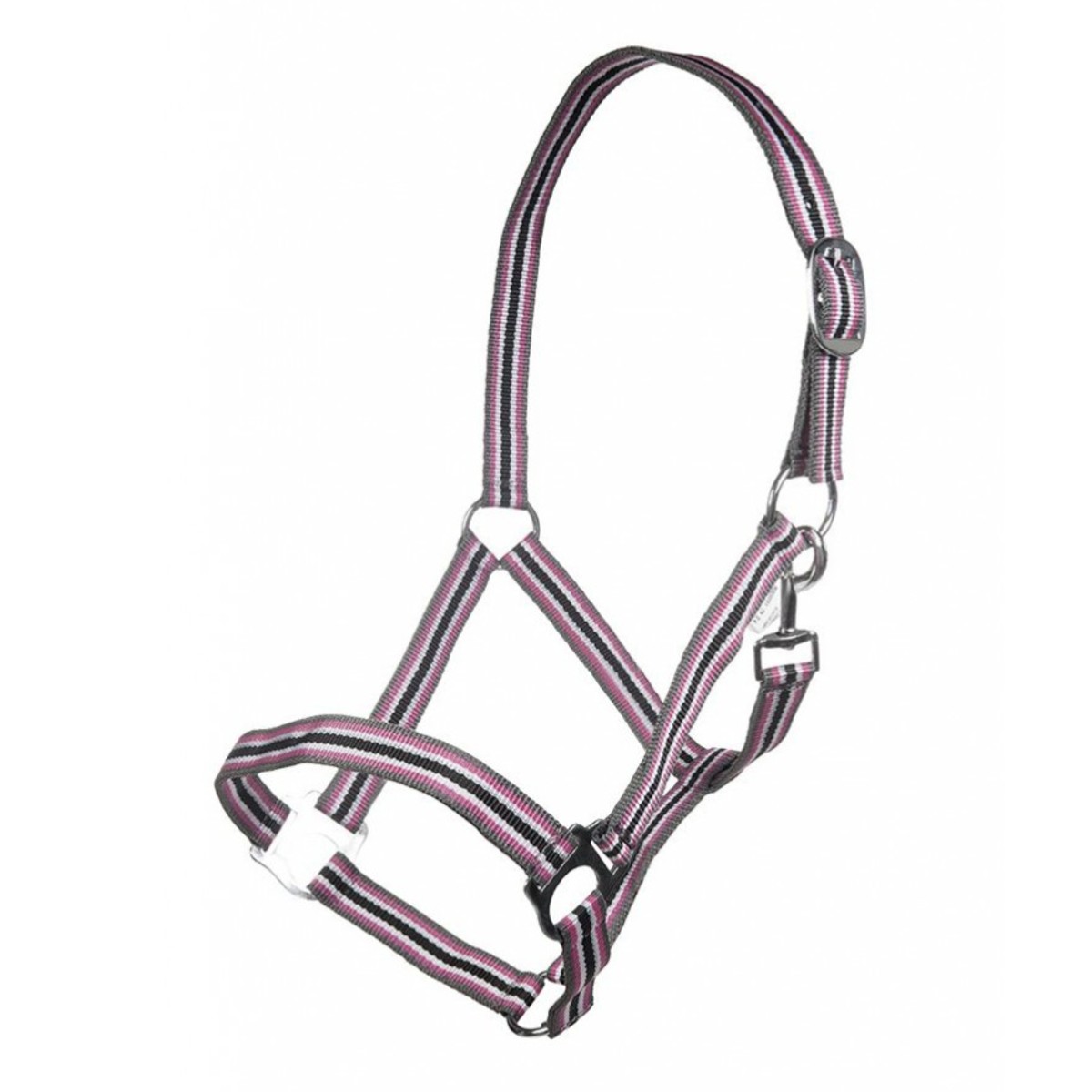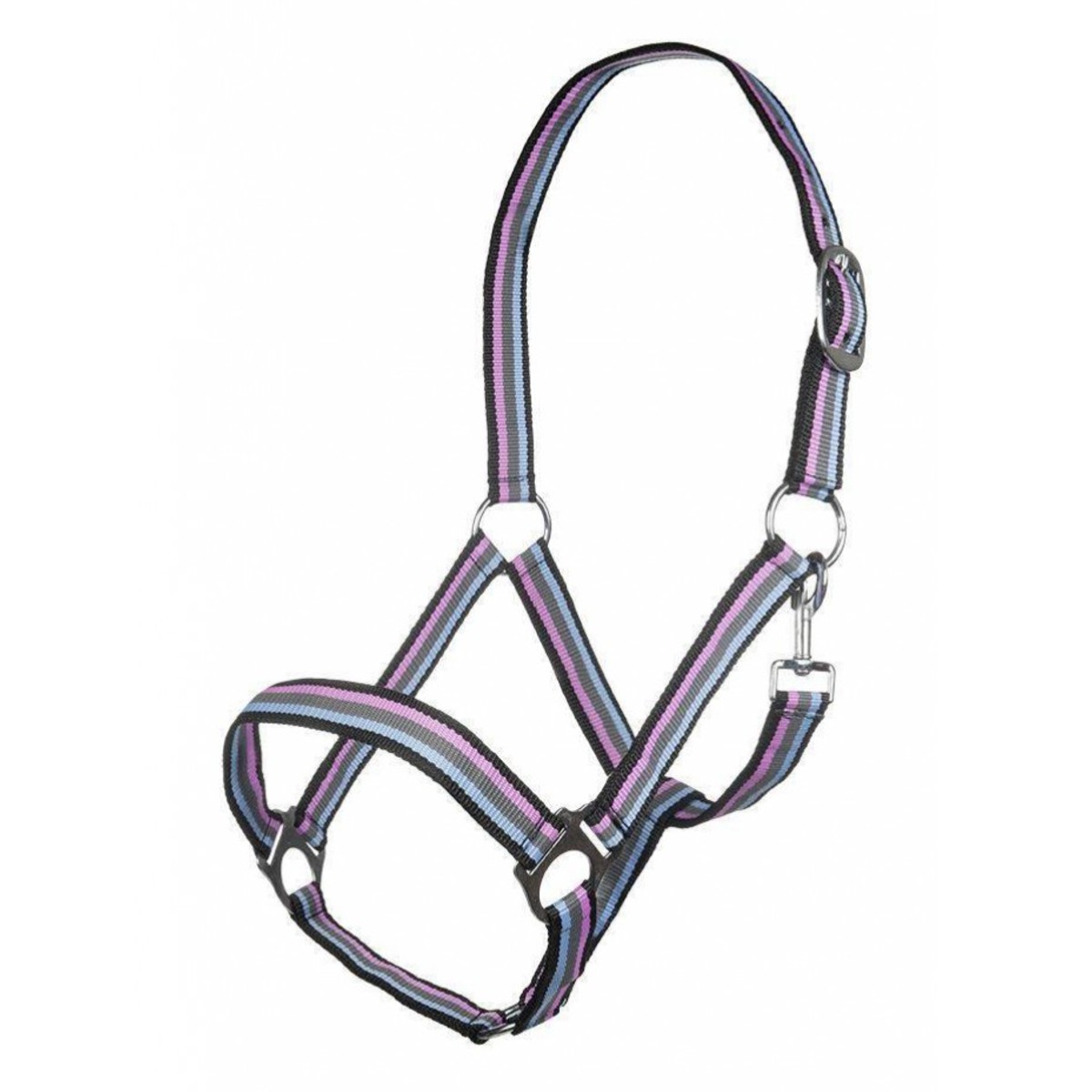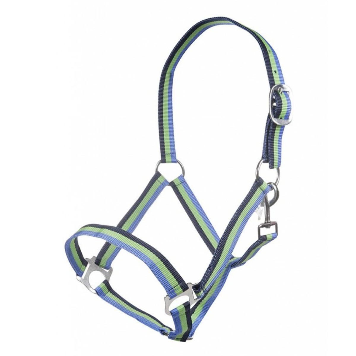 Прочный разноцветный нейлоновый недоуздок (Halter). Затылочный ремень регулируются. Недоуздок легко снимается и одевается благодаря карабину. Фурнитура серебристого цвета.