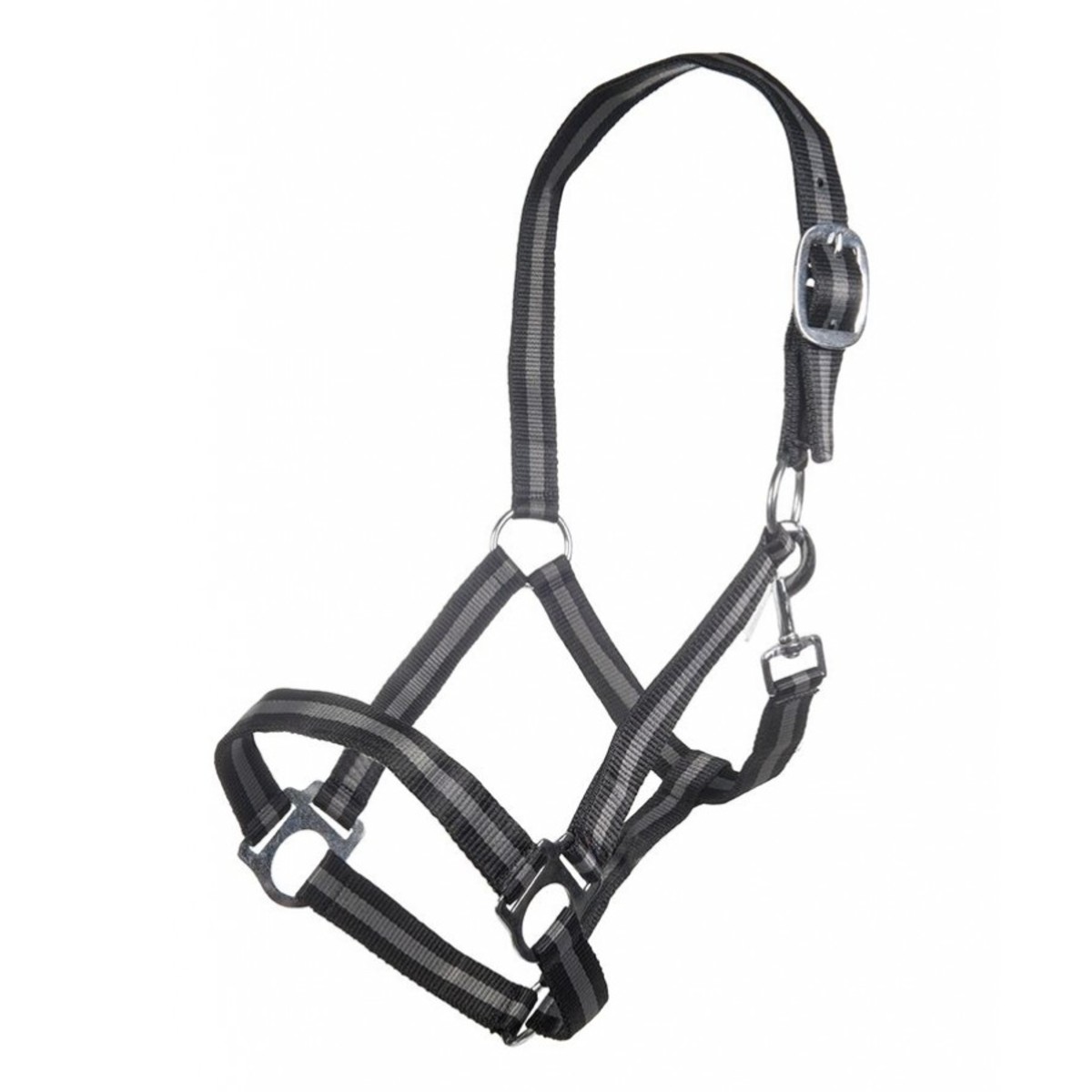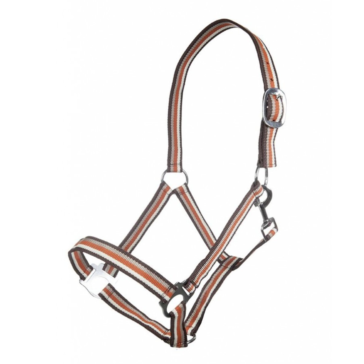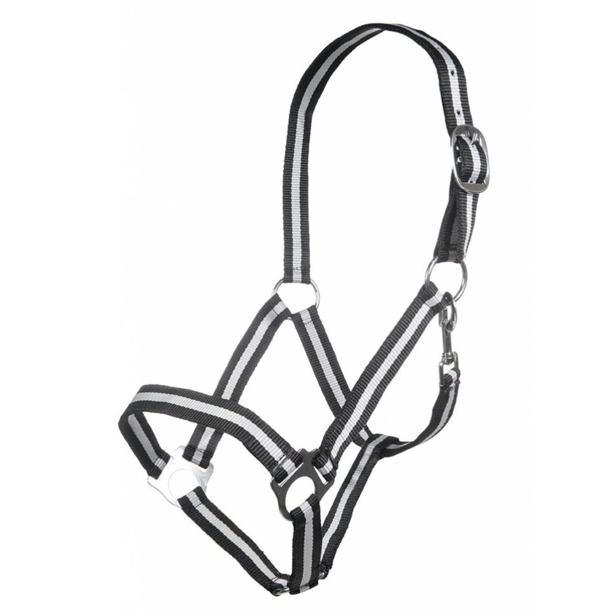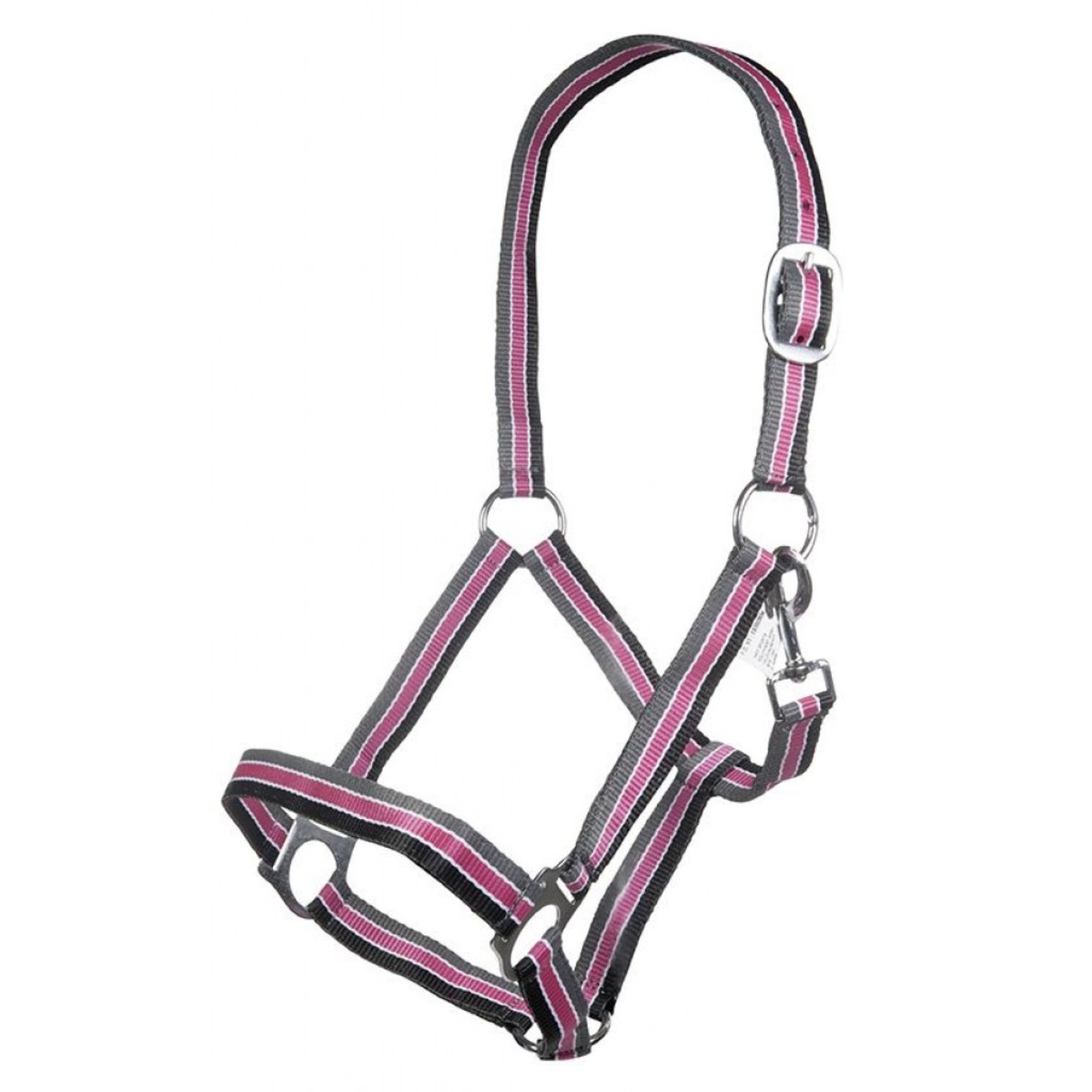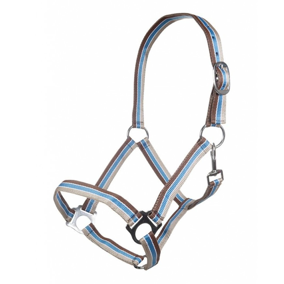 Прочный разноцветный нейлоновый недоуздок (Halter). Затылочный ремень регулируются. Недоуздок легко снимается и одевается благодаря карабину. Фурнитура серебристого цвета.