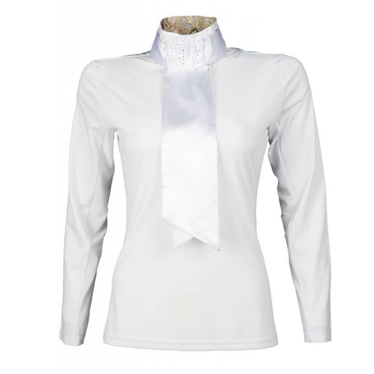 Элегантная блуза (blouse) для выступлений со съемным галстуком. Мягкая и эластичная ткань обеспечивает всаднику комфорт и свободу движений. Внутренняя сторона рукава выполнена из сетчатой ткани. Блузу можно использовать не только для выступлений. Галстук выполнен из атласной ткани и украшен стразами.