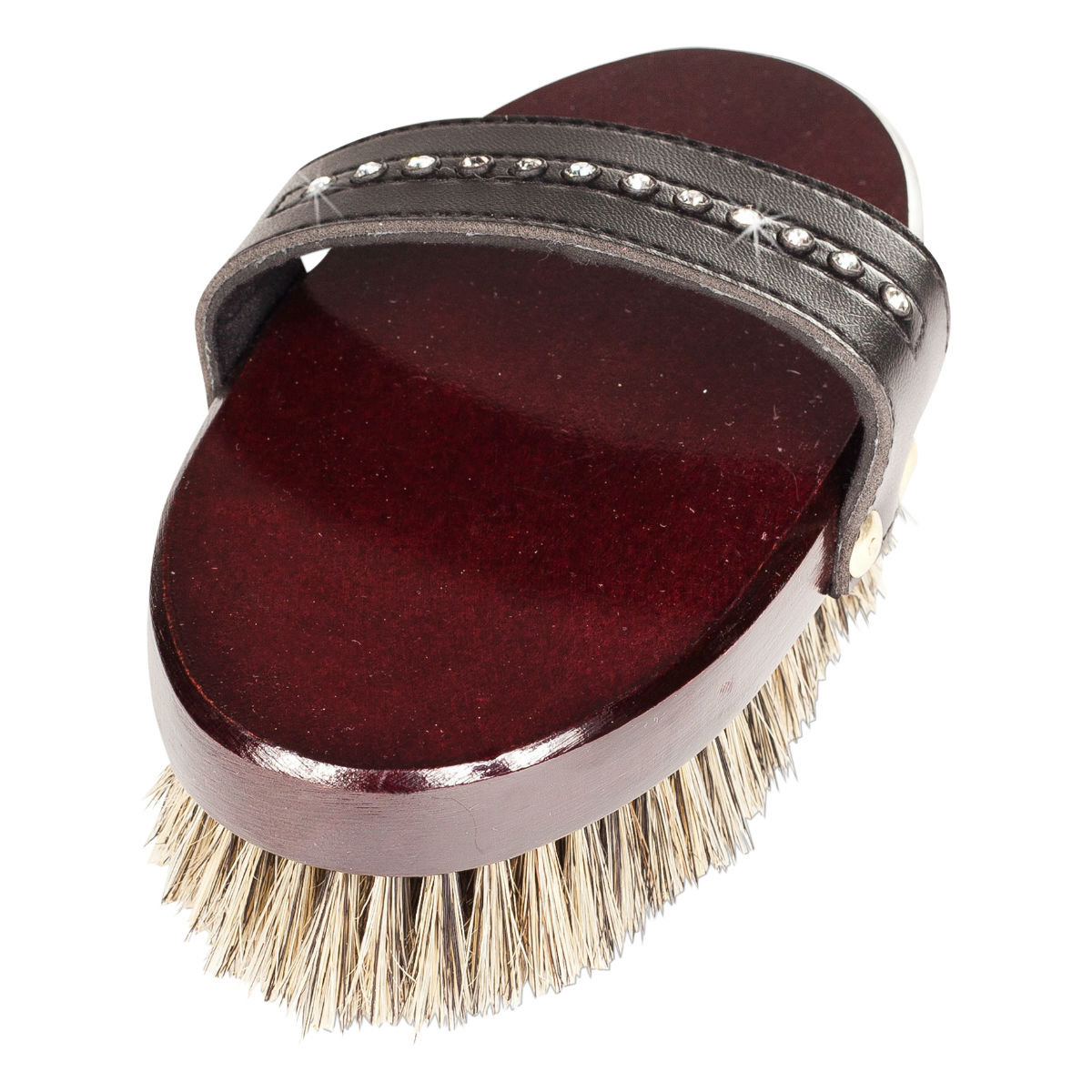 Щётка с натуральной смешаной свиной щетиной на деревянной основе. Обладает необычайной мягкостью. Благодаря мягкой структуре не травмирует и не выдирает шерсть. Подходит для бережной чистки морды лошади. Удобный ремешок для фиксации руки украшен кристаллами.