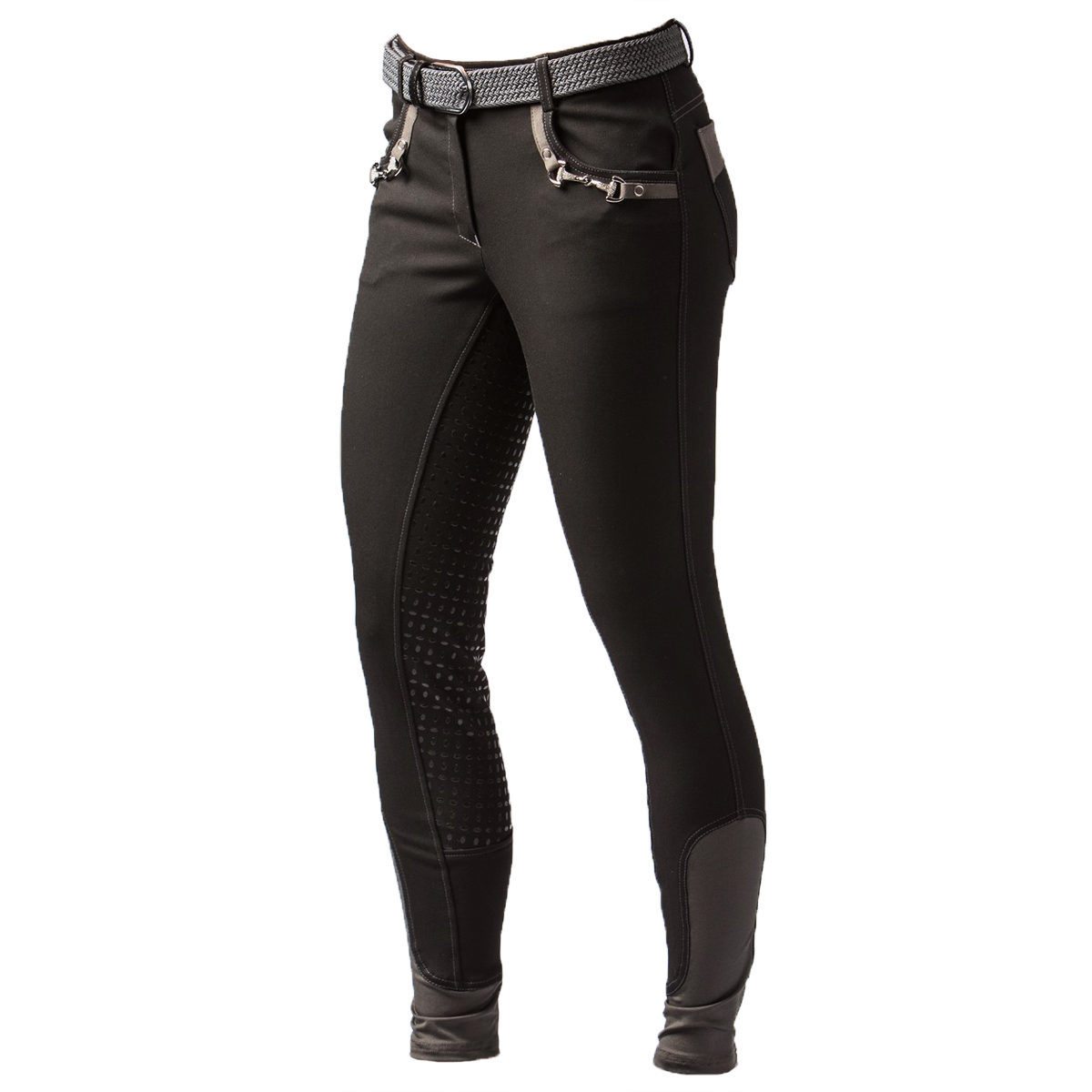 Женские бриджи с полной силиконовой леей (Riding Breeches with Silicone Patch). Смотрятся стильно благодаря серым вставкам. Силиконовая лея обеспечивает наибольшую фиксацию в седле. На поясе петли для ремня. Застёгиваются на молнию и брючный крючок. Два кармана спереди и два сзади. В области щиколотки имеются эластичные вставки для удобства одевания.