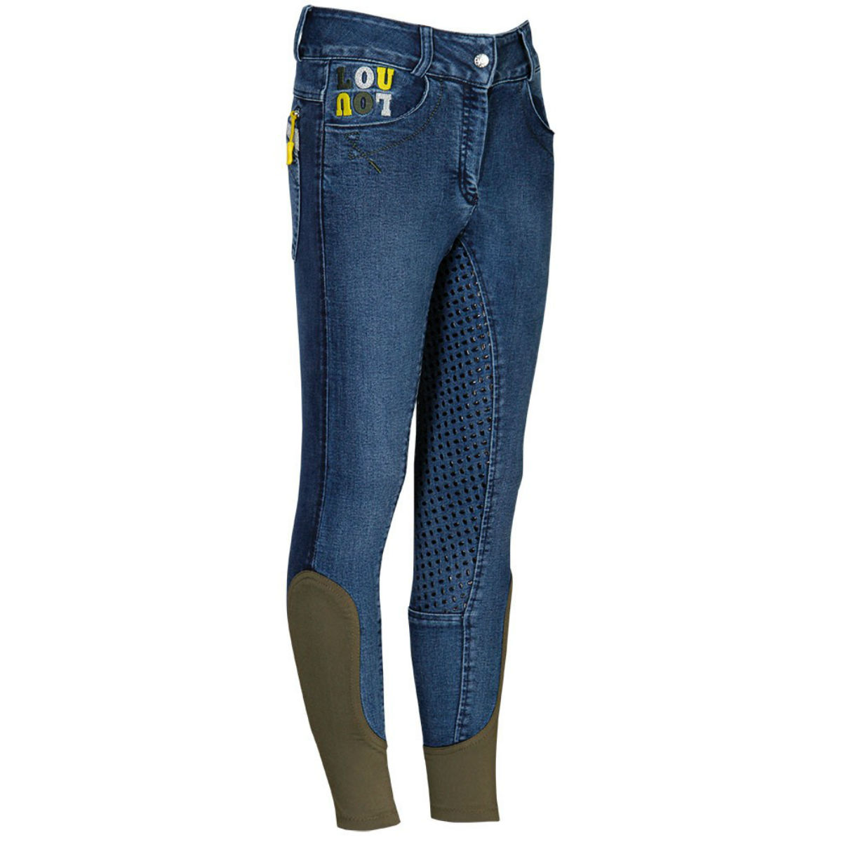 Детские джинсовые бриджи с полной силиконовой леей (Riding Breeches with Full Seat). Силиконовая лея обеспечивает наибольшую фиксацию в седле. Застёгиваются на молнию и брючный крючок. Два передних набедренных кармана и два кармана сзади. Над задними карманами декоративные молнии. Бриджи украшены небольшой вышивкой LOU LOU и серебряными вставками. В области щиколотки имеются эластичные контрастные вставки для удобства одевания.
