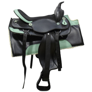 Седло Вестерн (Western Saddle) - прекрасный вариант для длительных прогулок. Его конструкция позволяет и всаднику, и лошади чувствовать себя комфортно в долгих поездках. Сиденье выполнено из натуральной замши. Отделка полок снизу выполнена из искусственного меха, что предотвращает натирание в течение прогулок. Седло украшено металлическими розетками. Контрастные вставки делают седло очень нарядным, что позволяет использовать седло не только для тренировок, прогулок и походов, но и для праздников и шоу!