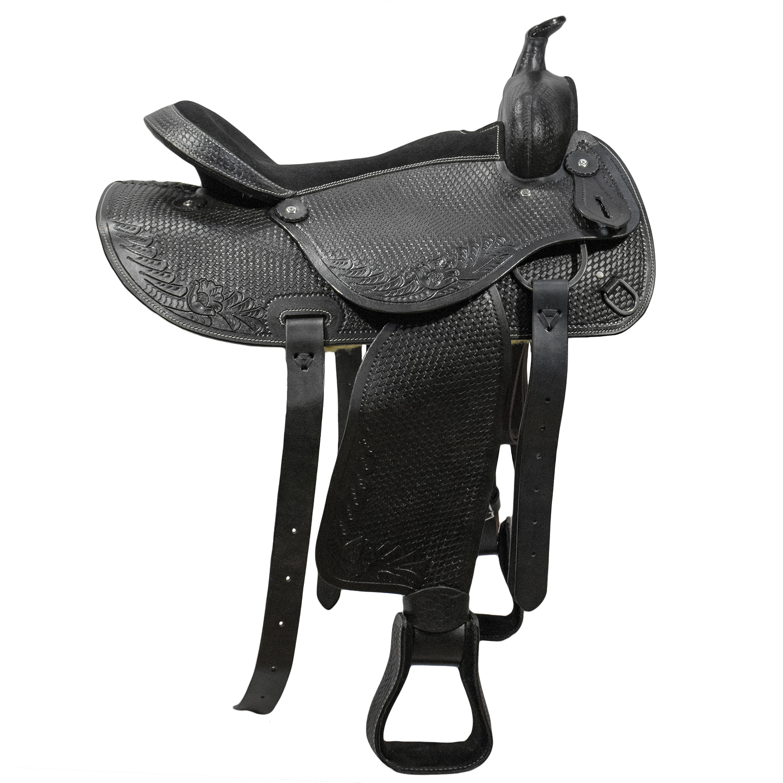 Седло Вестерн (Western Saddle) - прекрасный вариант для длительных прогулок. Его конструкция позволяет и всаднику, и лошади чувствовать себя комфортно в долгих поездках. Сиденье выполнено из натуральной замши. Отделка полок снизу выполнена из искусственного меха, что предотвращает натирание в течение прогулок. В комплект входят традиционные кожаные приструги и стремена с кожаным покрытием. Седло украшено кожаными розетками. Тиснение на коже делает седло очень нарядным, что позволяет использовать седло не только для тренировок, прогулок и походов, но и для праздников и шоу!