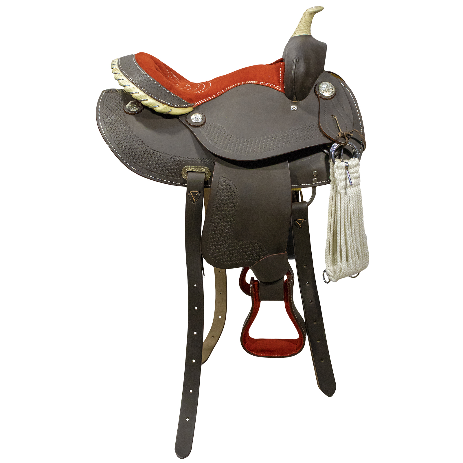 Седло в стиле вестерн для пони (Western Pony Saddle) сделано из натуральных материалов. Верх выполнен из натуральной кожи и замши. Оригинальный дизайн. Седло украшено декоративными розетками, вышивкой и тиснением. Стремена покрыты кожей и замшей. Внутренняя сторона отделана мягким искусственным мехом. Удобно для походов и длительных прогулок. Подходит для проката и праздников.