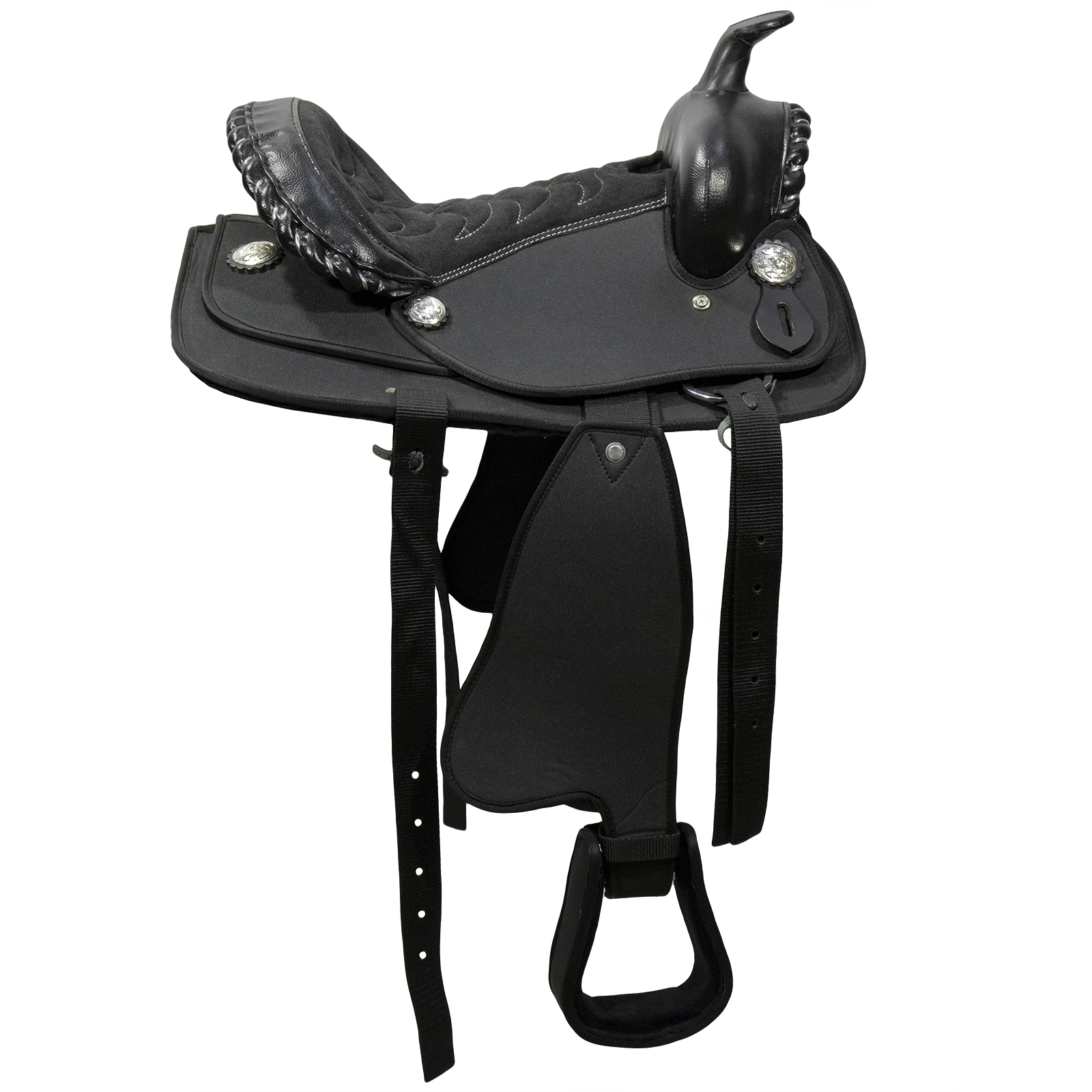 Седло в стиле вестерн для пони (Western Pony Saddle) сделано из синтетических материалов. Верх выполнен из искусственной замши. Оригинальный дизайн. Седло украшено декоративными розетками и вышивкой. Стремена покрыты прочным синтетическим материалом. Внутренняя сторона отделана мягким искусственным мехом. Удобно для походов и длительных прогулок. Подходит для проката и праздников.