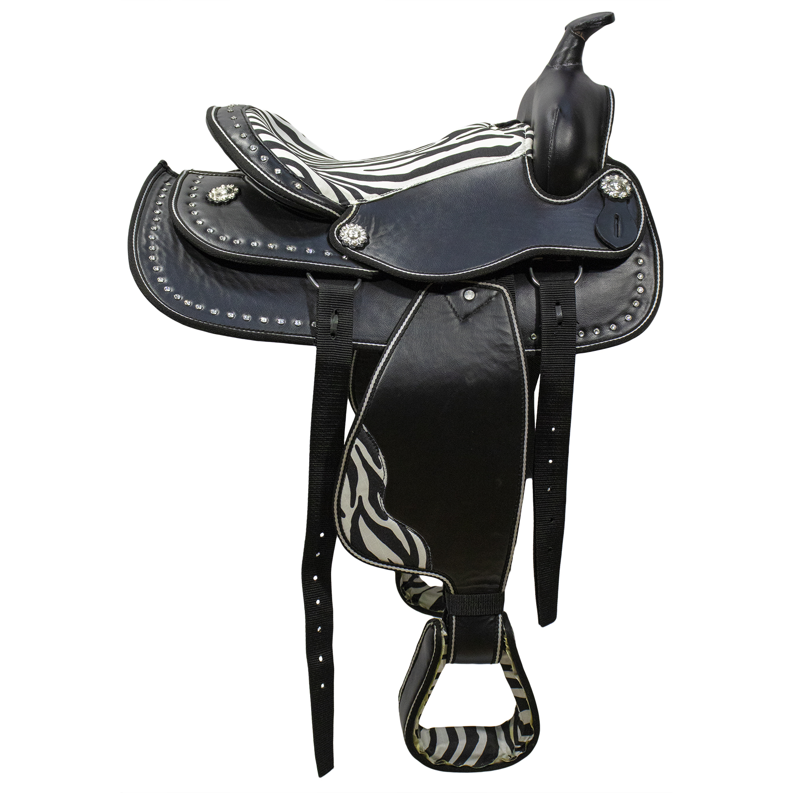 Седло в стиле вестерн для пони (Western Pony Saddle) сделано из синтетических материалов. Оригинальный дизайн. Седло украшено декоративными клёпками, розетками и вставками "зебра". Внутренняя сторона отделана мягким искусственным мехом. В комплекте нейлоновая подпруга. Удобно для походов и длительных прогулок. Подходит для проката и праздников.