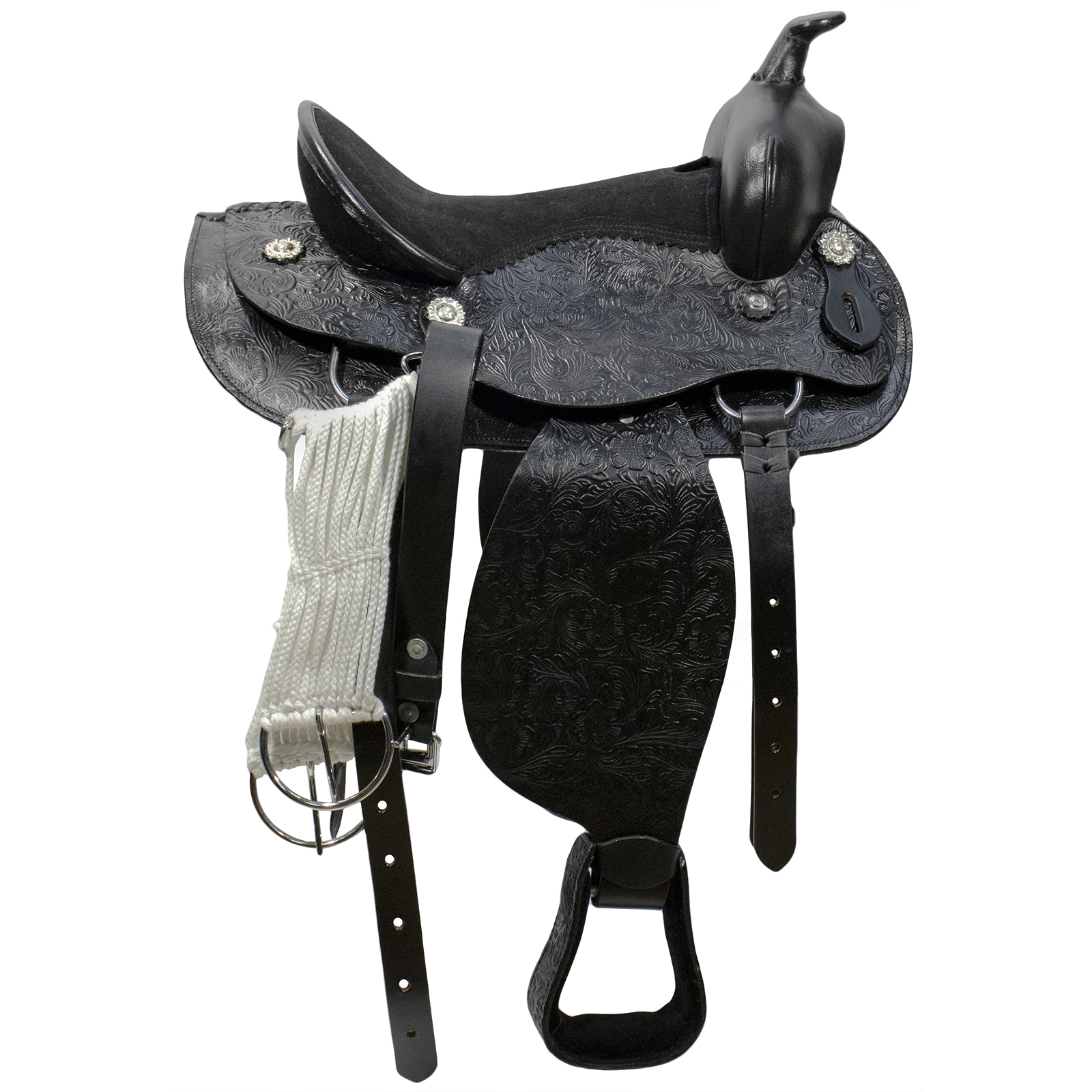 Кожаное седло для пони в стиле вестерн (Western Pony Saddle). Конструкция седла отличается высоко поднятым ленчиком, поэтому седло ляжет на любую холку. За счет ширины полок седла и расстояния между ними, седло будет безопасно как для лошади, так и для всадника. Также полки покрыты искусственным мехом, что предотвратит натирание спины лошади. Сиденье выполнено из натуральной замши. Металлическая фурнитура и тиснение на коже делают седло очень нарядным, что позволяет использовать седло не только для тренировок, прогулок и походов, но и для праздников и шоу!