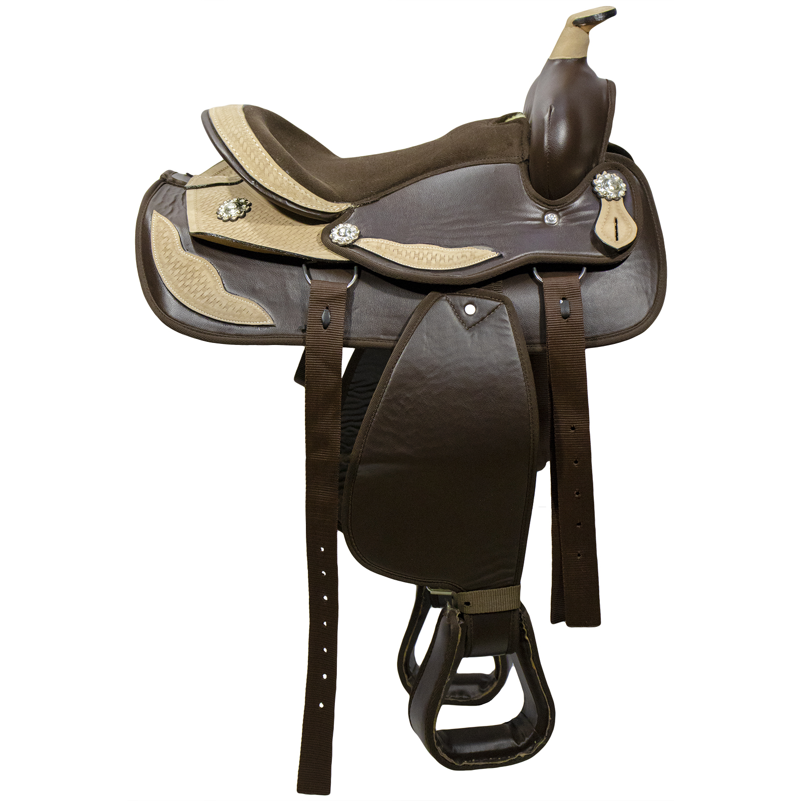 Седло Вестерн (Western Saddle) - прекрасный вариант для длительных прогулок. Его конструкция позволяет и всаднику, и лошади чувствовать себя комфортно в долгих поездках. Сиденье обтянуто искусственной замшей. Отделка полок снизу выполнена из искусственного меха, что предотвращает натирание в течение прогулок. В комплект входят традиционные приструги, нейлоновая подпруга и стремена. Седло украшено металлическими розетками.