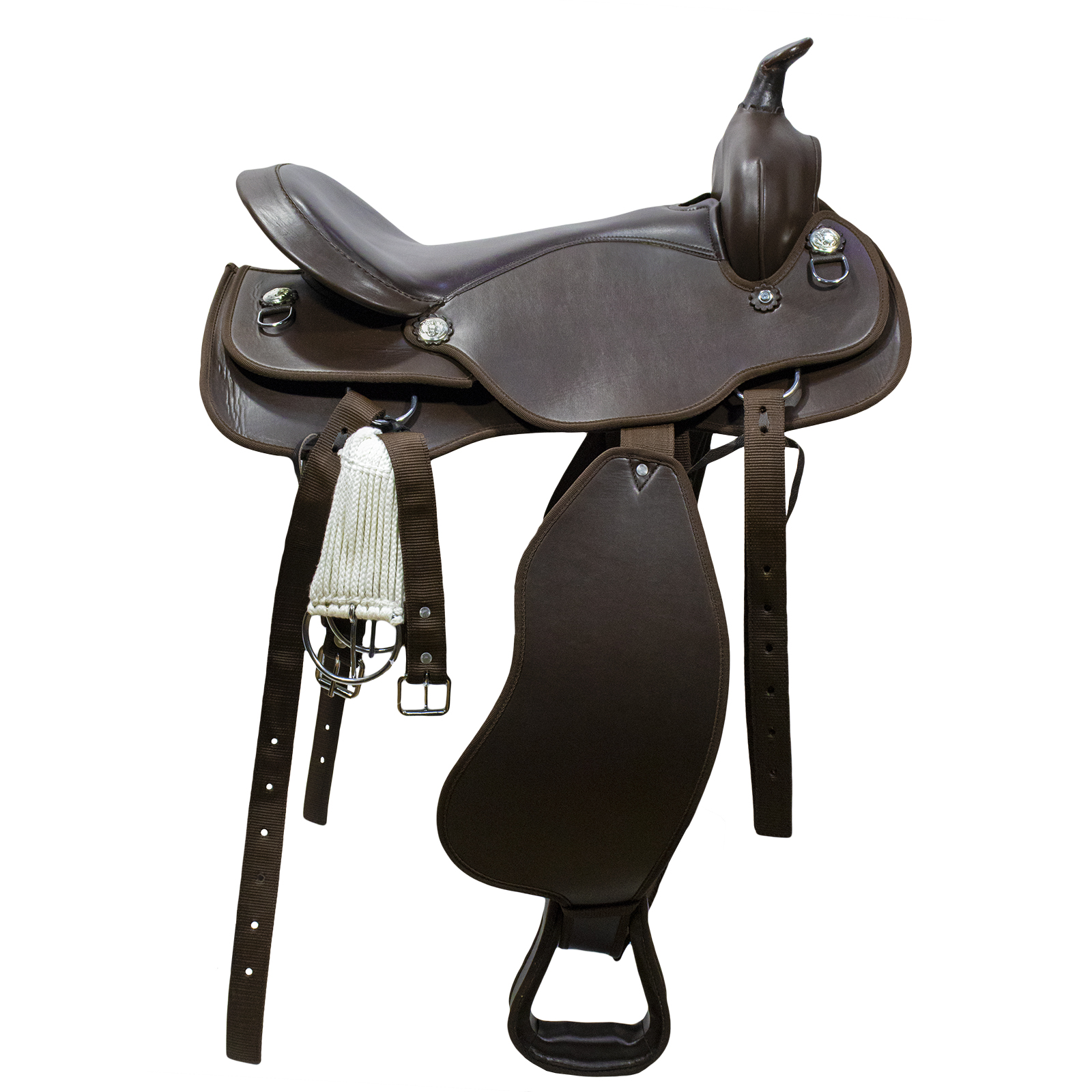 Седло Вестерн (Western Saddle) - прекрасный вариант для длительных прогулок. Его конструкция позволяет и всаднику, и лошади чувствовать себя комфортно в долгих поездках. Отделка полок снизу выполнена из искусственного меха, что предотвращает натирание в течение прогулок. В комплект входят традиционные приструги, передняя веревочная подпруга, задняя нейлоновая подпруга и стремена. Седло украшено металлическими розетками. Седло отлично подходит для прогулок и походов.