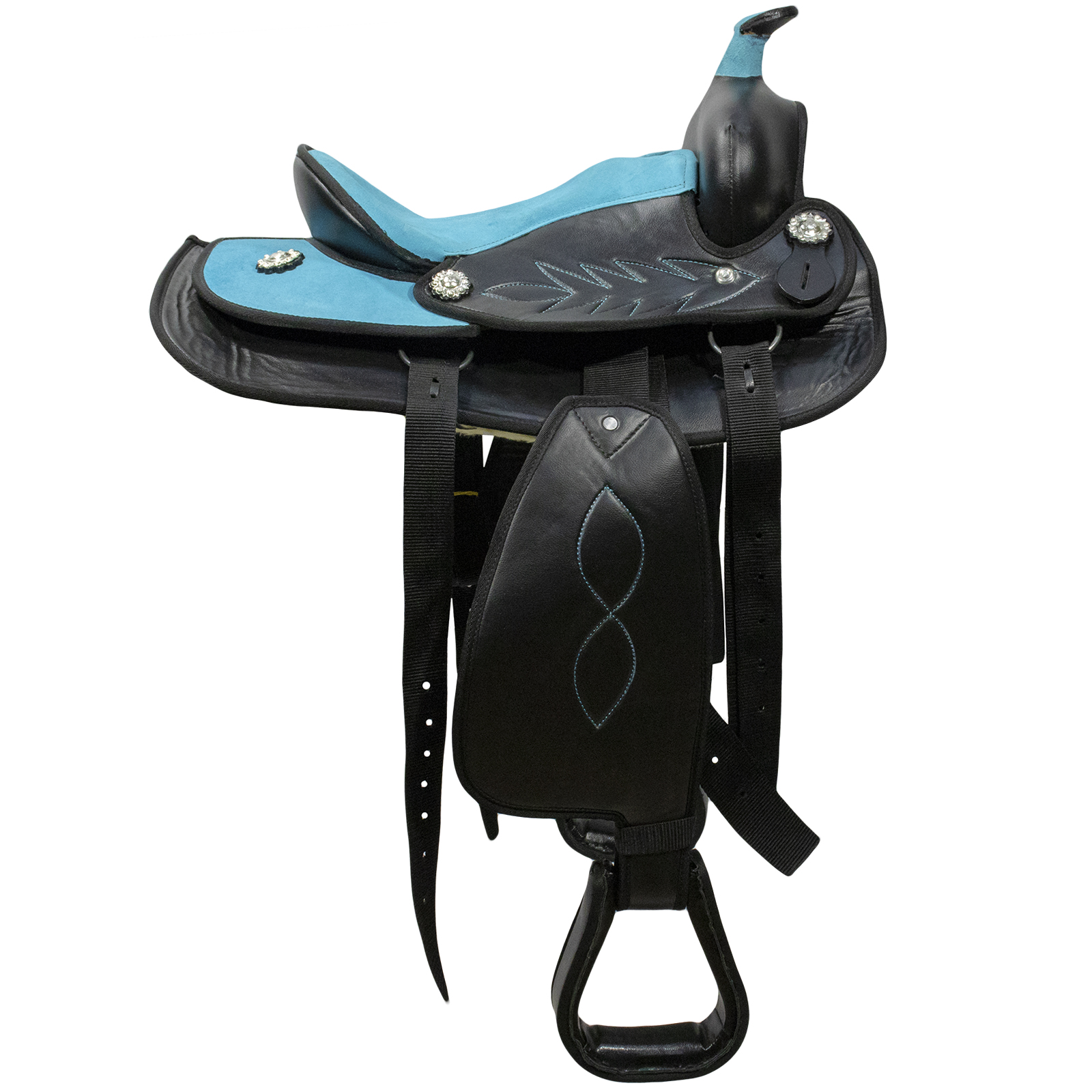 Седло в стиле вестерн для пони (Western Pony Saddle) сделано из синтетических материалов. Верх выполнен из натуральной замши. Оригинальный дизайн. Седло украшено вышивкой. Стремена покрыты прочным синтетическим материалом. Внутренняя сторона отделана мягким искусственным мехом. Нейлоновая подпруга в комплекте. Удобно для походов и длительных прогулок. Подходит для проката и праздников.