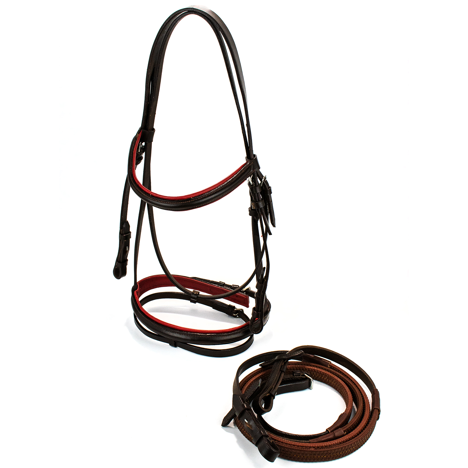 Оголовье из натуральной кожи (Leather Bridle) с поводом-шлангом. Мягкие подложки красного цвета на капсюле и налобном ремнях делает уздечку комфортной даже для чувствительных лошадей. В комплекте с уздечкой идет повод-шланг с ограничителями. Фурнитура из нержавеющей стали. Трензель в комплект не входит.