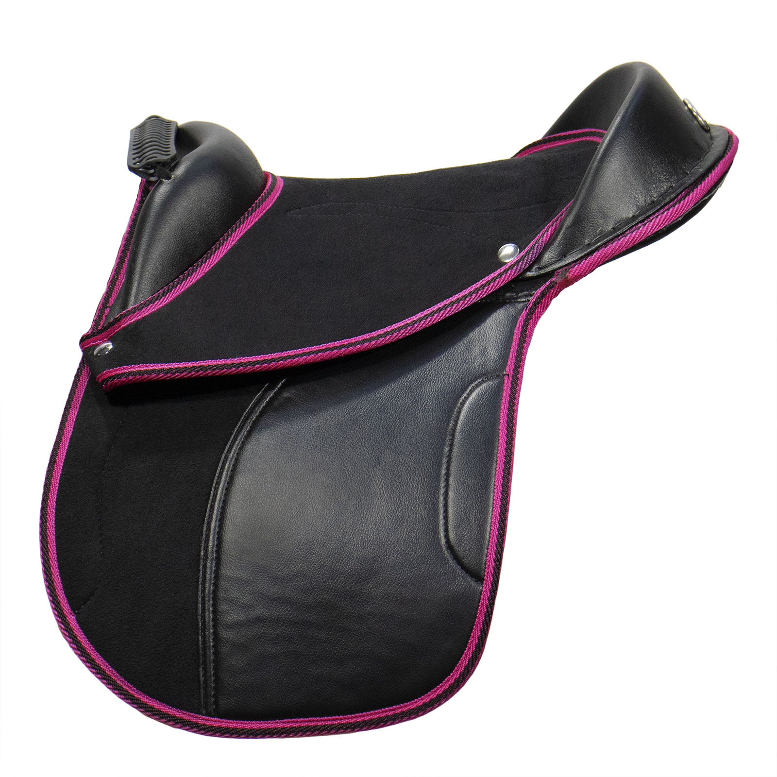 Седло PONY изготовлено из искусственной кожи. Для удобства всадника сиденье и передняя часть крыльев покрыты искусственной замшей. Седло отделано декоративной тесьмой розового цвета. Упоры под крылом фиксируются на липучке, что позволяет легко подстроить седло под разных всадников. При необходимости, упоры можно убрать. Удобная ручка на передней луке позволяет маленькому всаднику крепко держаться во время езды. В комплект седла входят легкие алюминиевые стремена, кожаные путлища (110 см), тесьмяная подпруга (100 см). Все это удобно переносить в специальной прилагающейся сумочке.