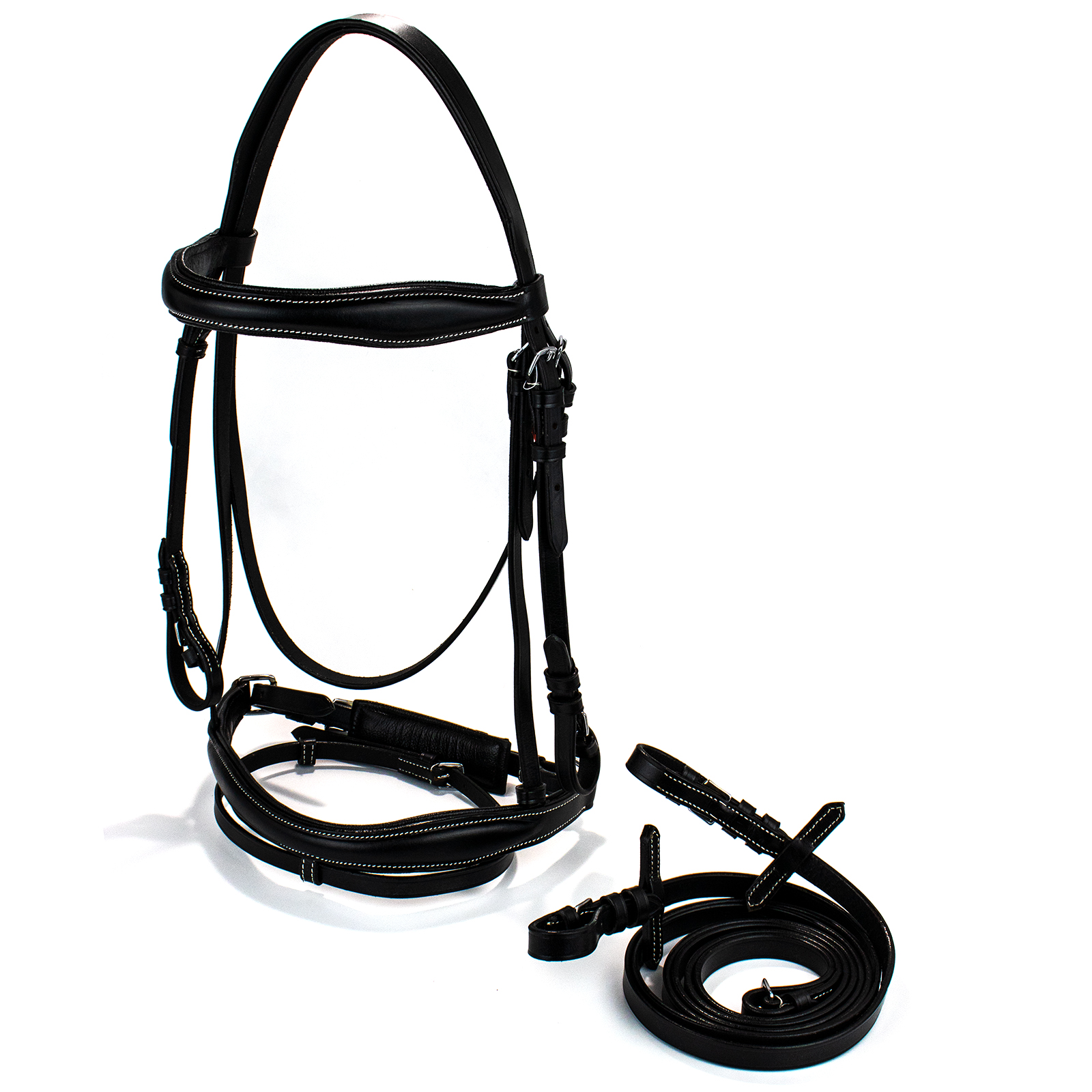 Оголовье из высококачественной натуральной кожи (Leather Bridle) с фигурным капсюлем и налобником. Мягкая подложка на капсюле и налобном ремнях делает уздечку комфортной даже для чувствительных лошадей. В комплекте с уздечкой идет кожаный повод с ограничителями. Капсюль самозатягивающийся. Уздечка украшена контрастной отстрочкой. Кожа высокого качества и фурнитура из нержавеющей стали обеспечат долгую службу уздечки.