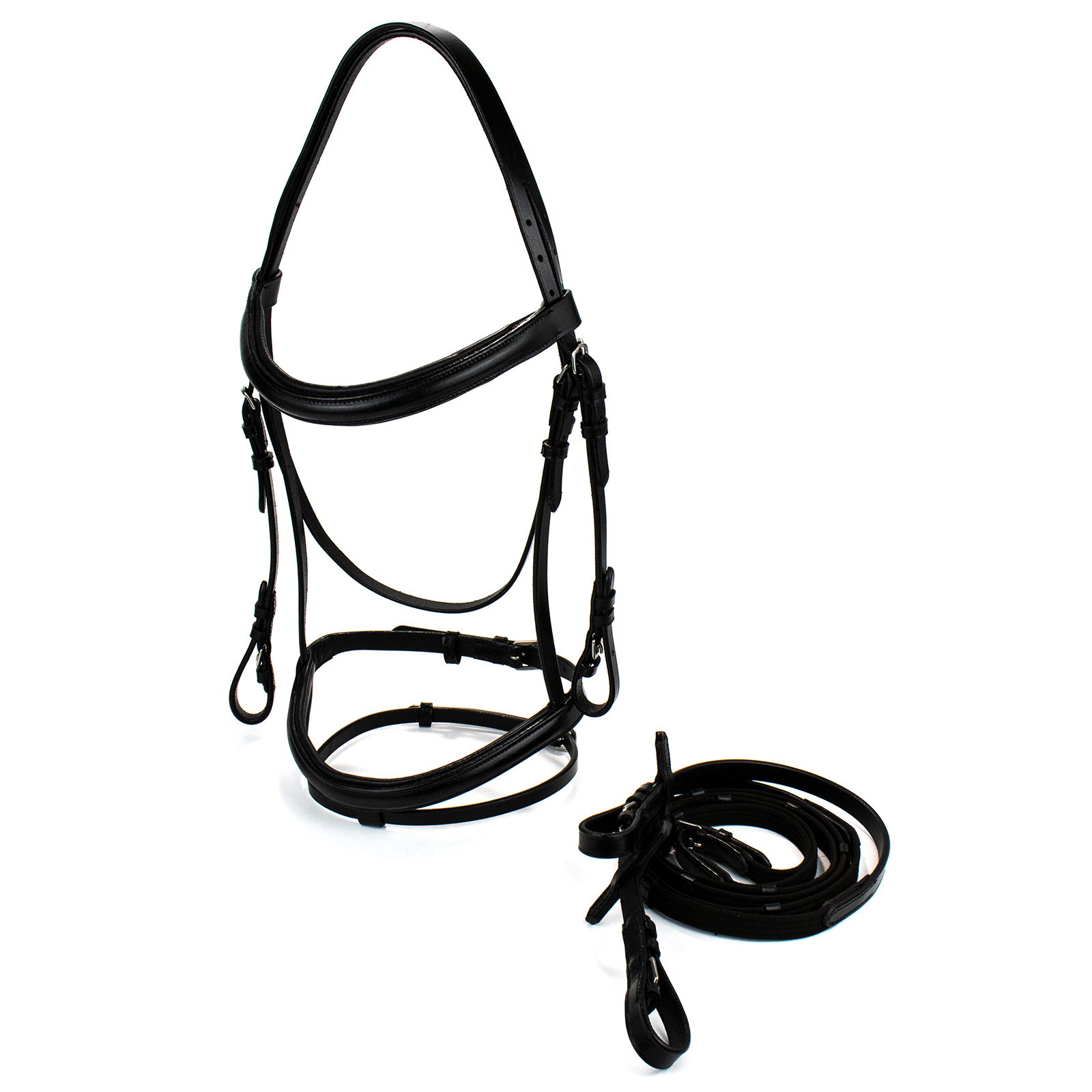Классическое оголовье из мягкой кожи (Leather Bridle). Мягкая подложка на капсюле и налобном ремнях. Простой капсюль снабжен съемным ремешком-восьмеркой. В комплект входит тесьмяный повод с ограничителями и нашивками против скольжения. Фурнитура серебряного цвета. Трензель в комплект не входит.
