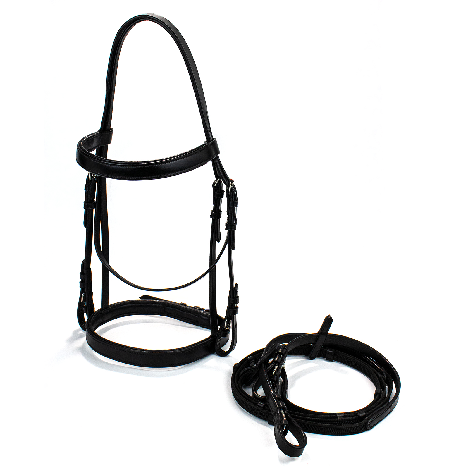 Классическое оголовье из мягкой кожи (Leather Bridle). Мягкая подложка на капсюле и налобном ремнях. Капсюль без восьмерки. Уздечка идет в комплекте с прорезиненным поводом. Фурнитура серебряного цвета. Трензель в комплект не входит.
