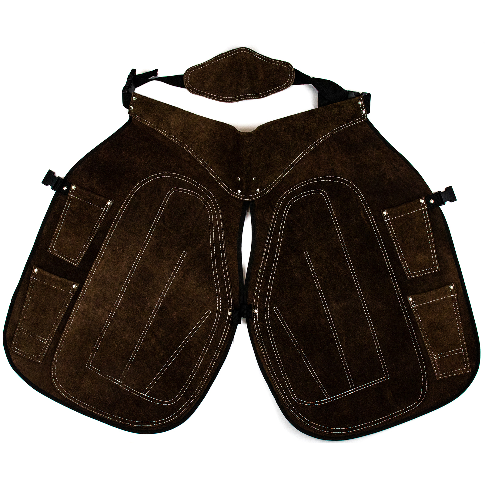 Из натуральной прочной замши. Один размер. Крепится на поясе с помощью ремня. На ремнях вокруг ног.