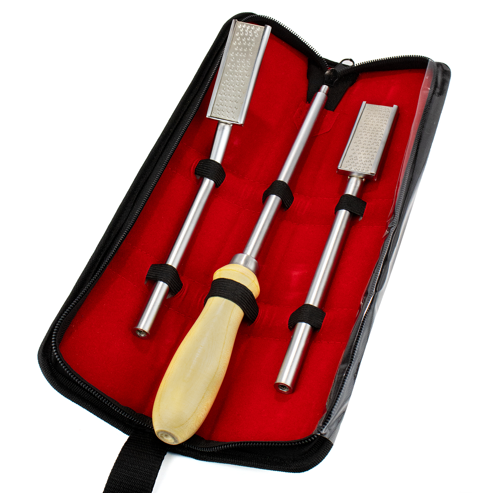 Рашпиль для подпиливания зубов с деревянной ручкой и двумя сменными насадками.